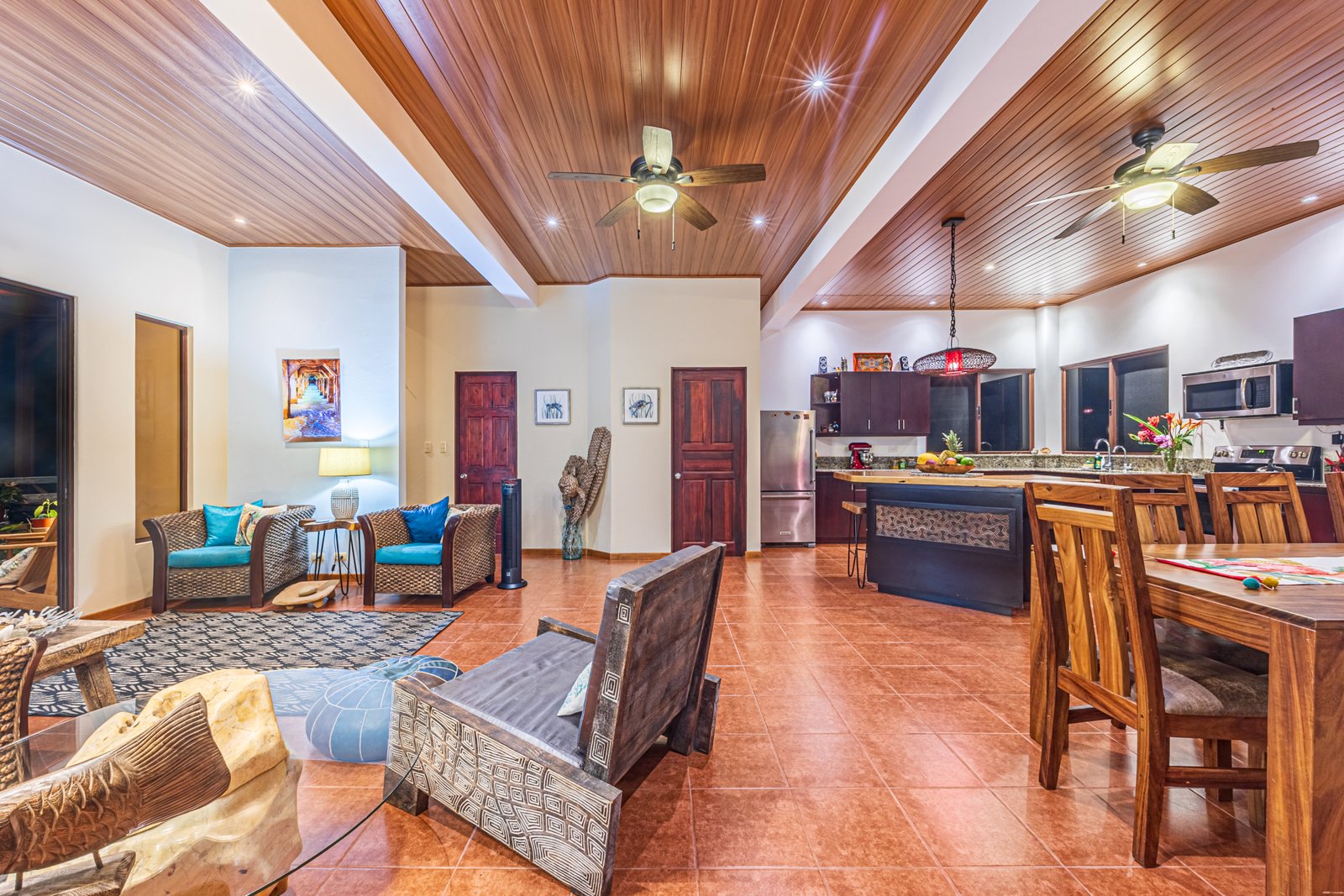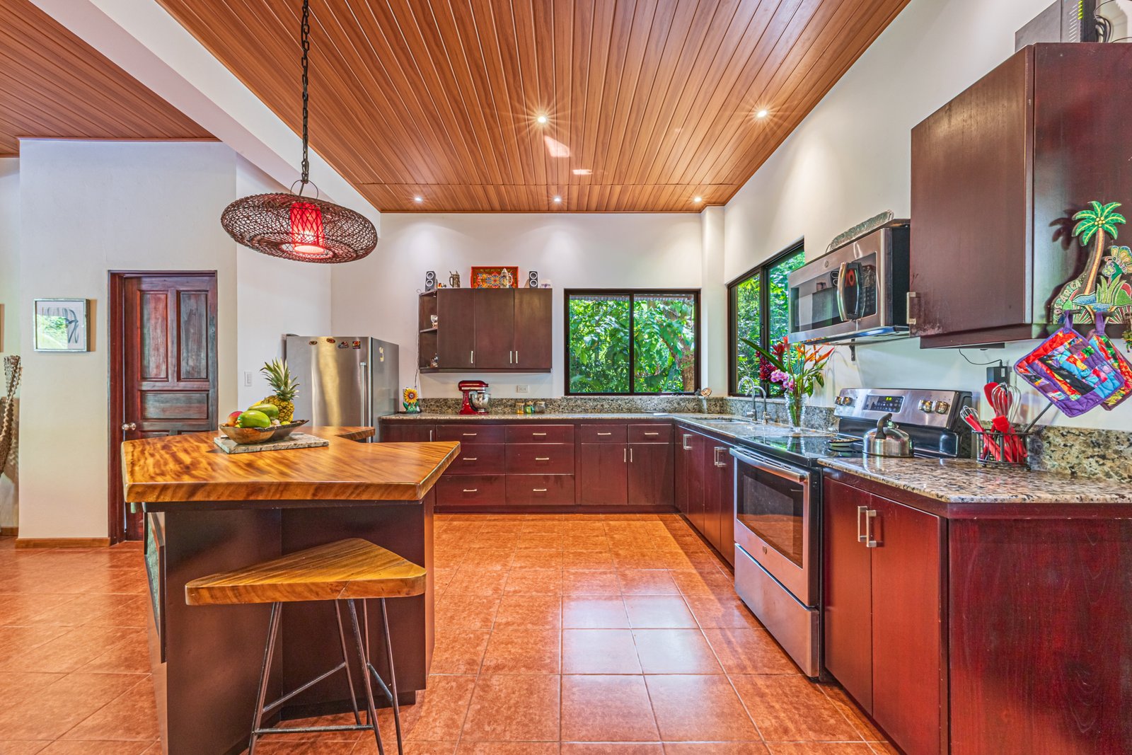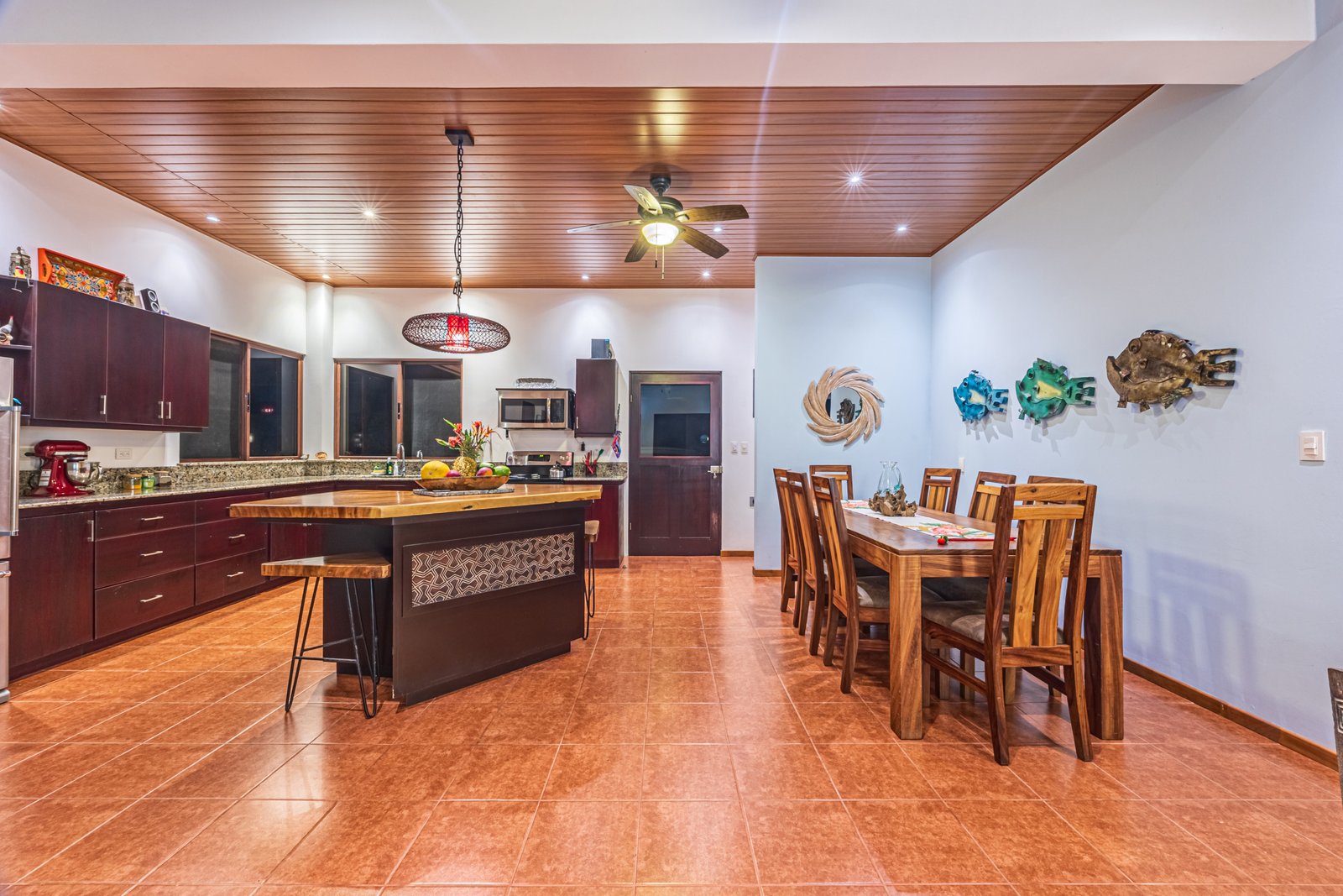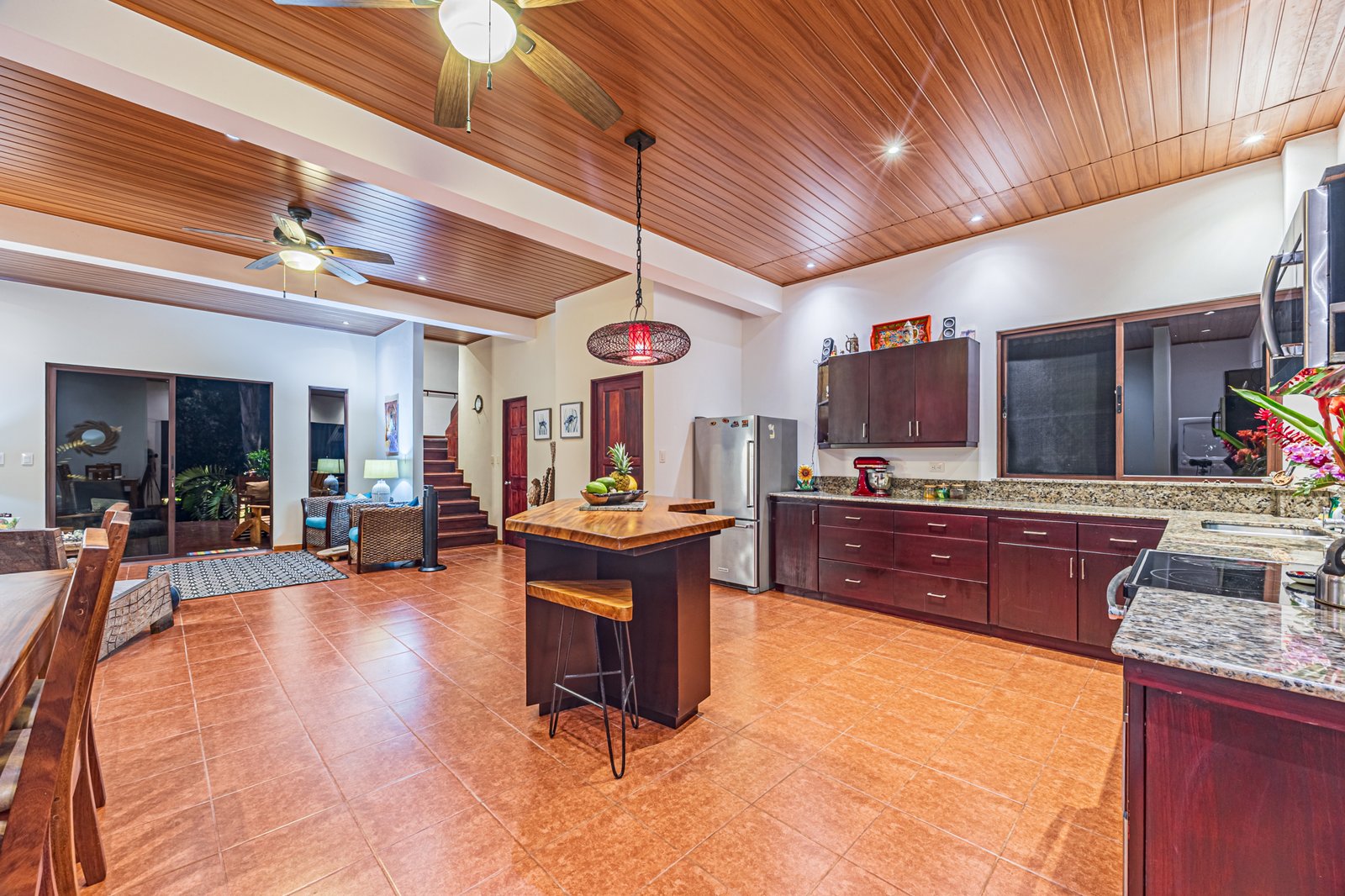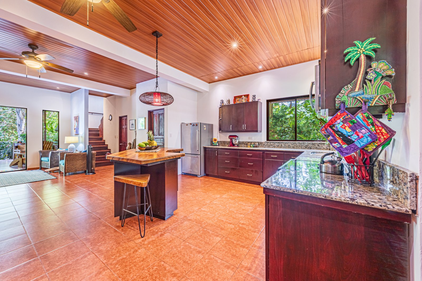 La casa cuenta con una magnífica cocina interior y exterior y un rancho, con una enorme sala de estar cubierta en la parte delantera, junto a la piscina. Tres de los cinco dormitorios tienen amplios porches que se conectan directamente con ellos. La cocina cuenta con encimeras de granito nuevas y una isla a medida con una cubierta de una sola pieza de Guanacaste y dos taburetes a juego. En el segundo nivel, hay dos amplios dormitorios, una sala de estar ideal como oficina y un enorme porche exterior para tomar el sol, practicar yoga, contemplar las estrellas al atardecer y mucho más.