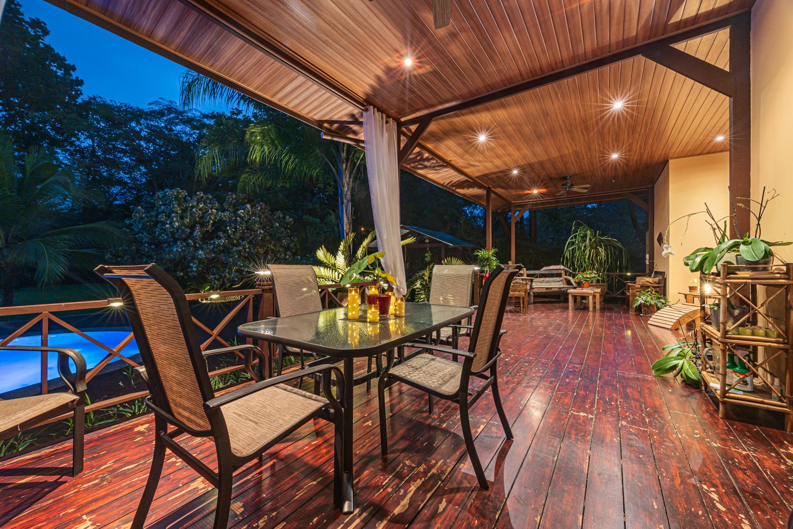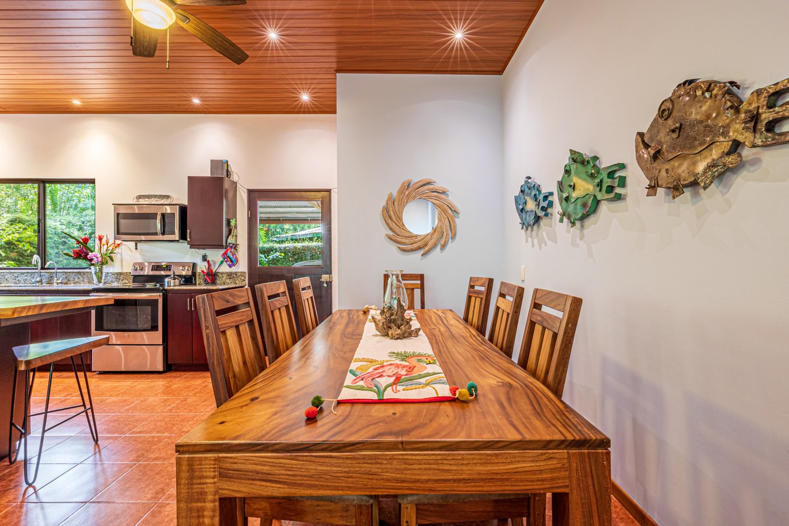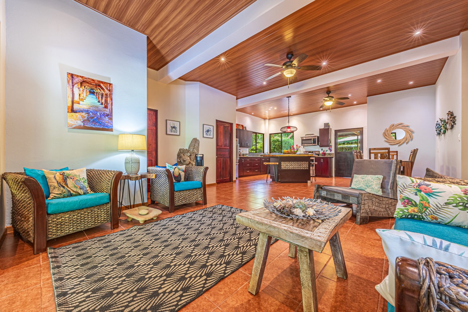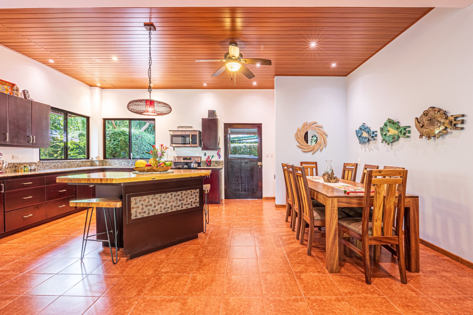 La casa cuenta con una magnífica cocina interior y exterior y un rancho, con una enorme sala de estar cubierta en la parte delantera, junto a la piscina. Tres de los cinco dormitorios tienen amplios porches que se conectan directamente con ellos. La cocina cuenta con encimeras de granito nuevas y una isla a medida con una cubierta de una sola pieza de Guanacaste y dos taburetes a juego. En el segundo nivel, hay dos amplios dormitorios, una sala de estar ideal como oficina y un enorme porche exterior para tomar el sol, practicar yoga, contemplar las estrellas al atardecer y mucho más.