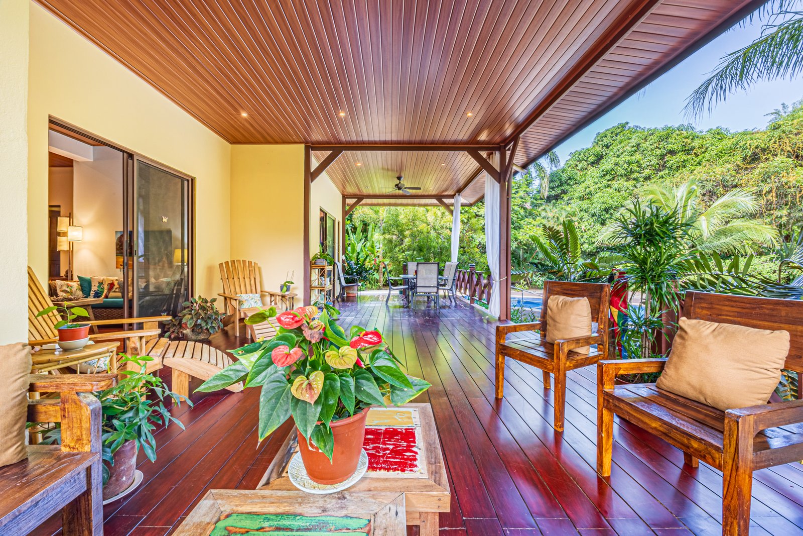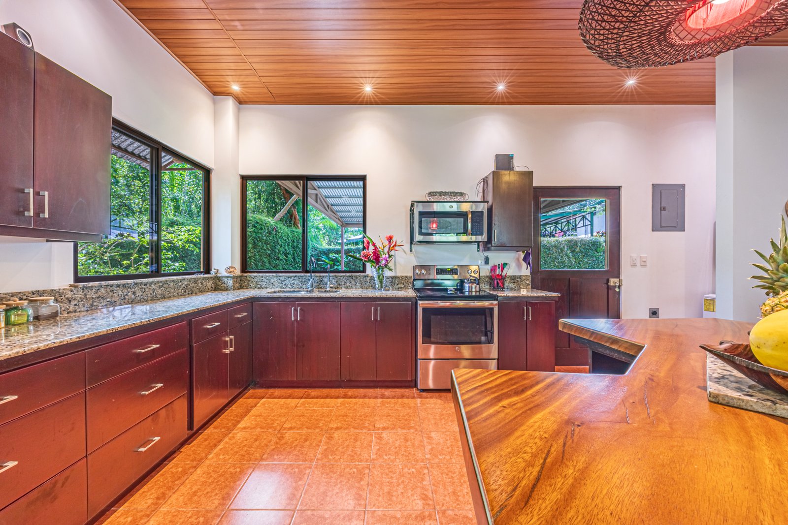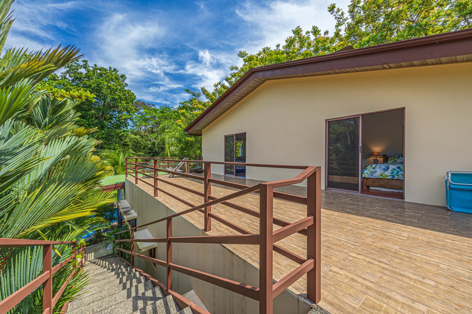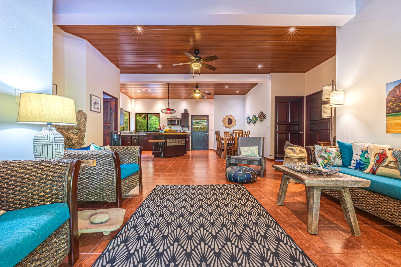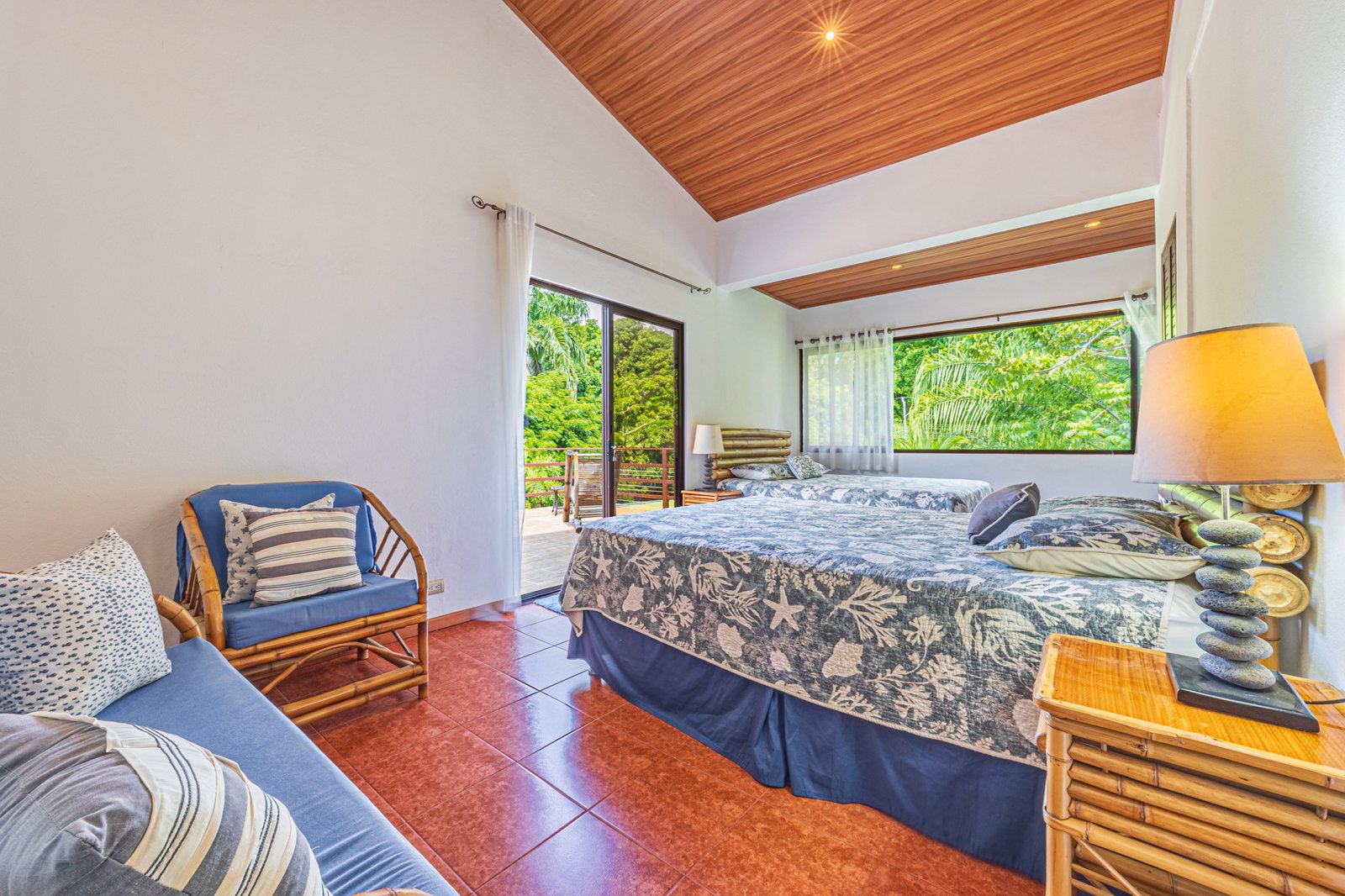 La casa cuenta con una magnífica cocina interior y exterior y un rancho, con una enorme sala de estar cubierta en la parte delantera, junto a la piscina. Tres de los cinco dormitorios tienen amplios porches que se conectan directamente con ellos. La cocina cuenta con encimeras de granito nuevas y una isla a medida con una cubierta de una sola pieza de Guanacaste y dos taburetes a juego. En el segundo nivel, hay dos amplios dormitorios, una sala de estar ideal como oficina y un enorme porche exterior para tomar el sol, practicar yoga, contemplar las estrellas al atardecer y mucho más.