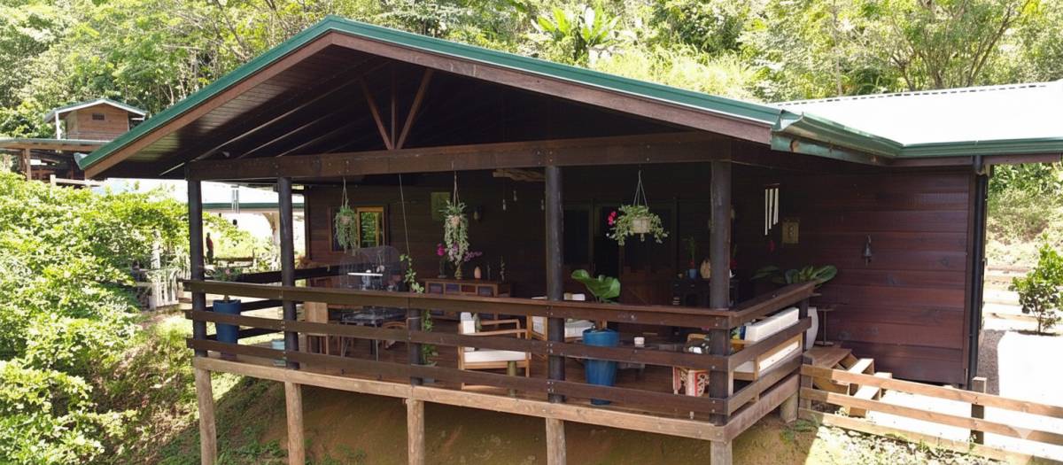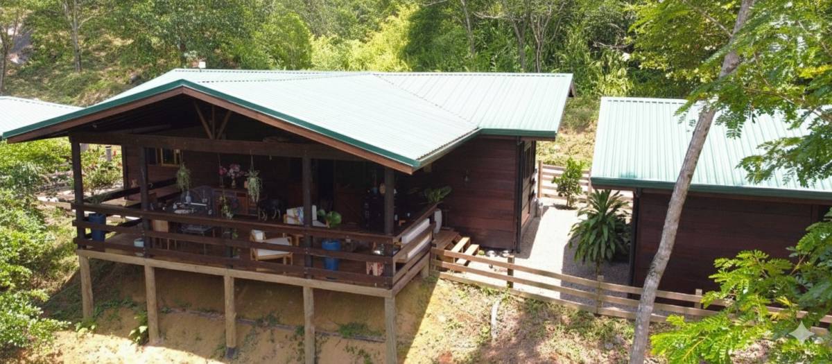 Bienvenido a su refugio privado en la montaña en las exuberantes colinas de Tres Ríos, Osa, Puntarenas: un encantador chalet de madera ubicado en una serena propiedad cerrada de 2,5 hectáreas rodeada de árboles maduros de teca y cedro, bordeado por un tranquilo arroyo y coronado con impresionantes vistas a las montañas.