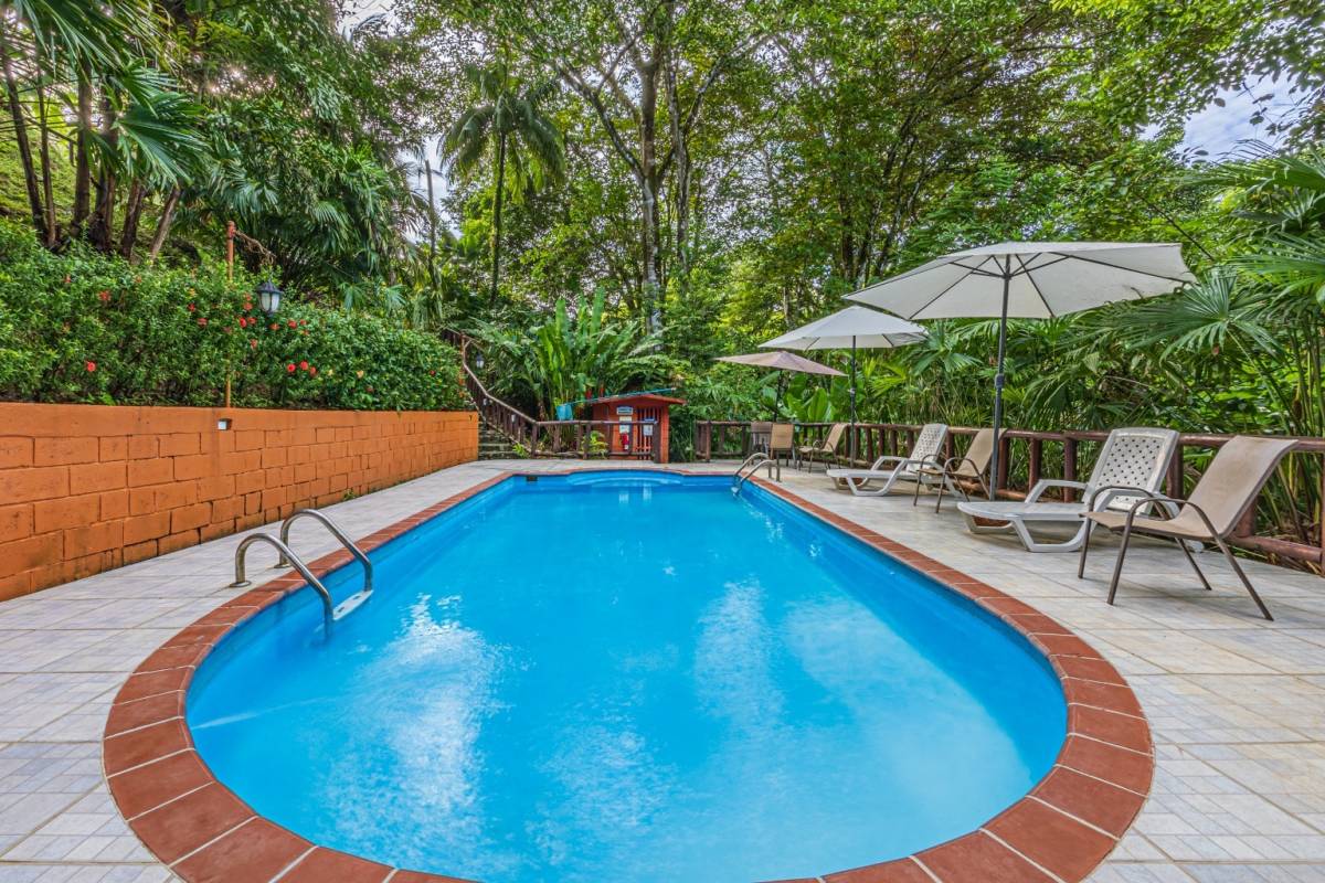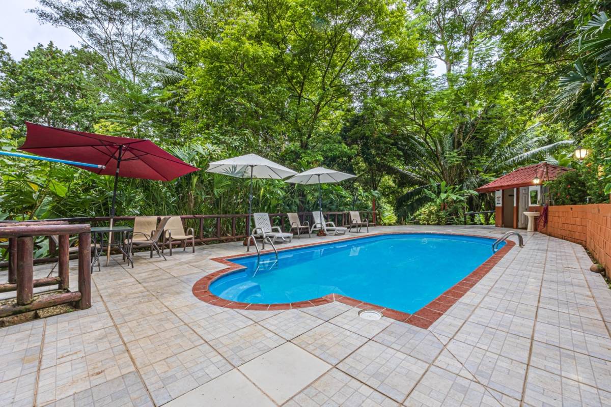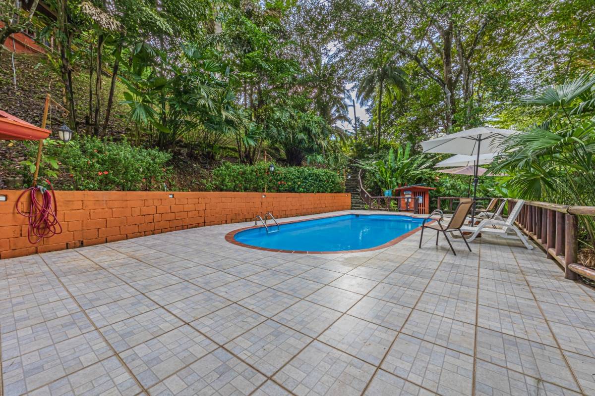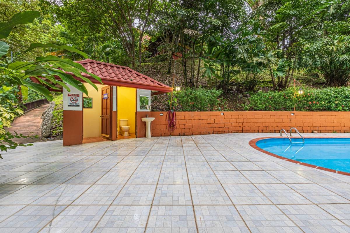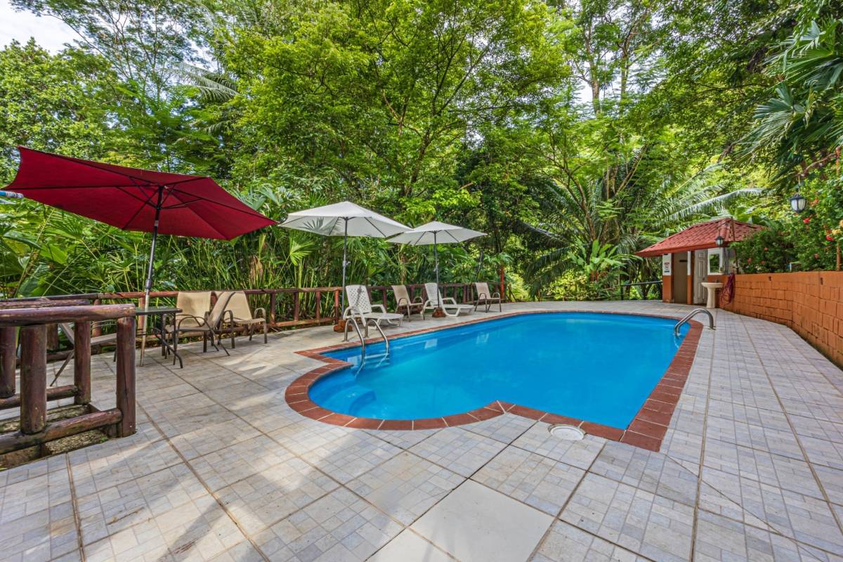 Servicios: La gran piscina de fibra de vidrio, de fácil mantenimiento, es un elemento destacado, con una amplia terraza amueblada con tumbonas y sombrillas, rodeada de plantas tropicales. Los monos suelen pasar volando, lo que realza la experiencia exótica. El área compartida para invitados incluye un baño con acceso al exterior y amplio espacio para una posible cocina y barbacoa al aire libre.