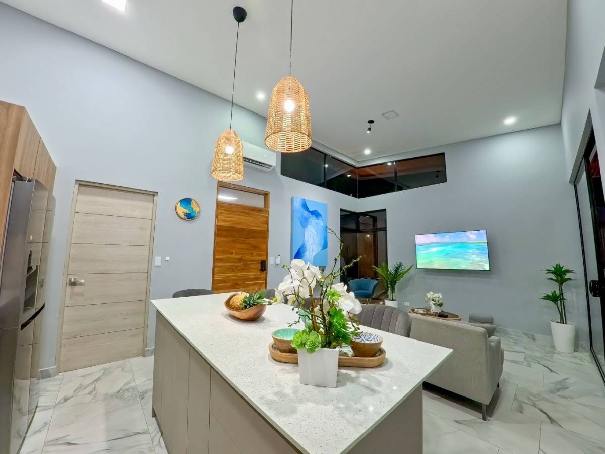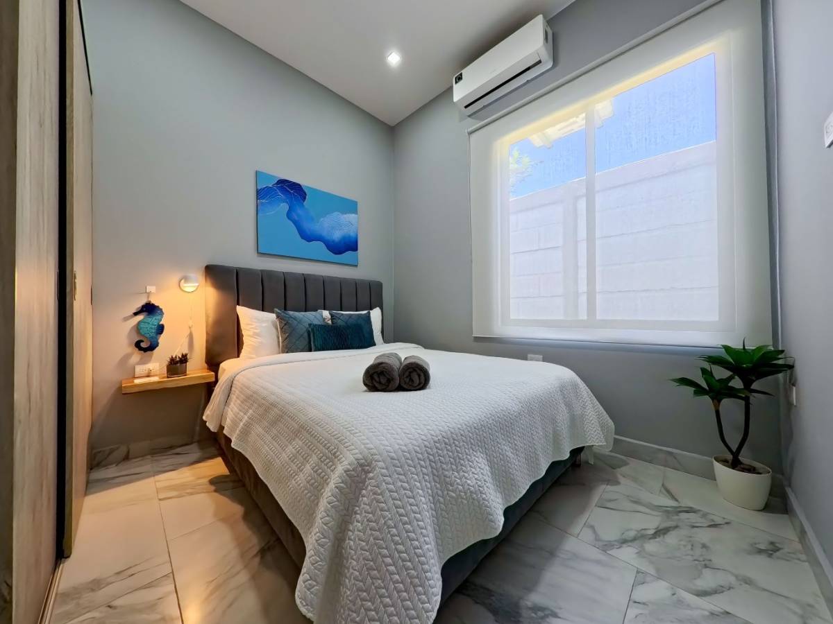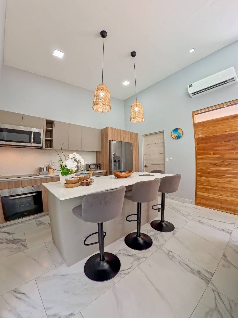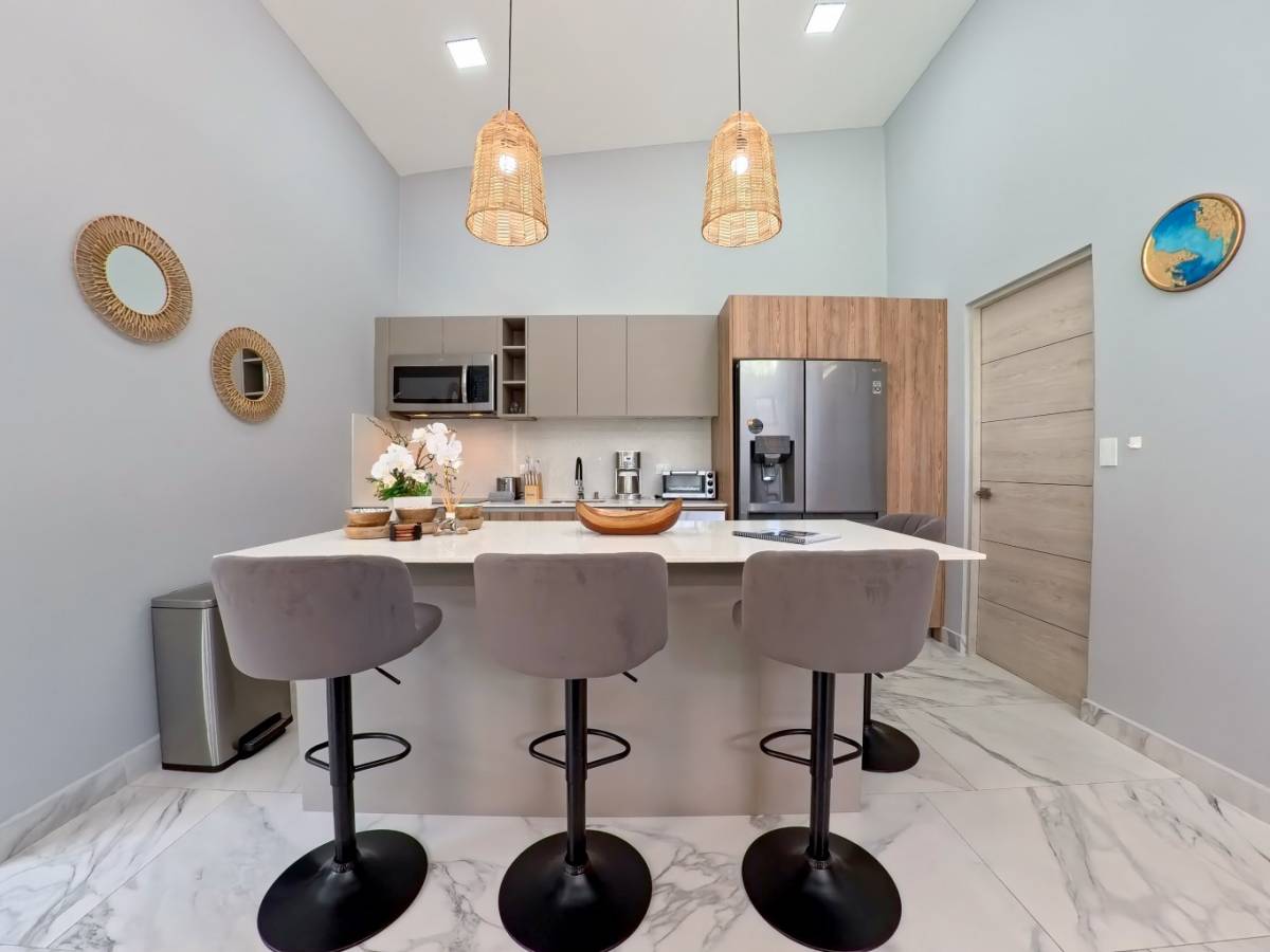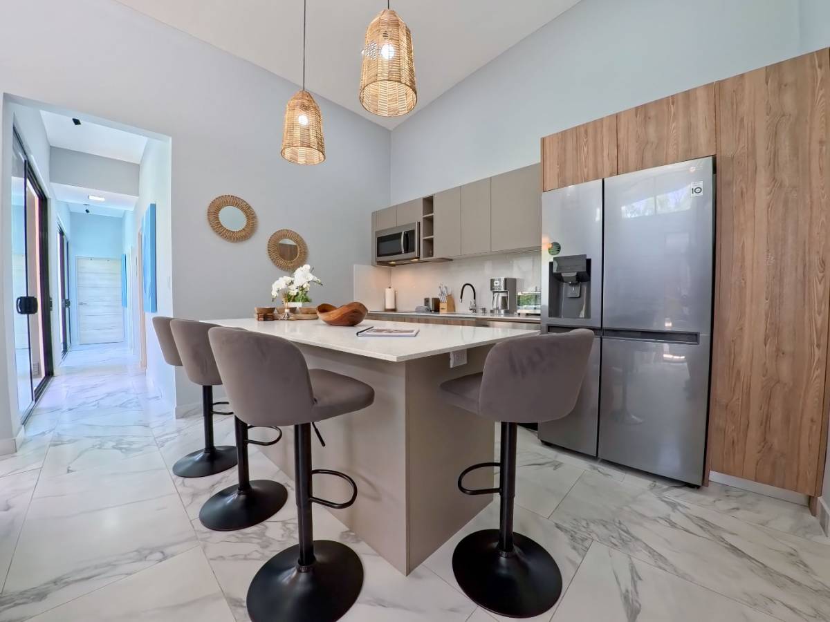 Cette maison au design soigné comprend 3 chambres spacieuses (dont une avec un lit king-size et deux avec des lits queen-size) et 2 salles de bain complètes. Elle offre un parking pour un véhicule et une piscine privée. La propriété inclut un débarras extérieur et une cuisine élégante équipée de meubles haut de gamme, d'un îlot en quartz et d'une crédence assortie. Une terrasse extérieure avec barbecue est idéale pour recevoir. À l'intérieur, la maison bénéficie d'un éclairage LED, d'interrupteurs connectés et d'une impressionnante hauteur sous plafond de 3,2 mètres qui crée une atmosphère lumineuse et aérée. La climatisation est installée dans toutes les chambres et les pièces de vie, et l'eau chaude est disponible dans toute la maison. Construite en blocs de béton massif 100%, cette maison est entièrement meublée et équipée de tous les principaux appareils électroménagers, prête à vous accueillir.