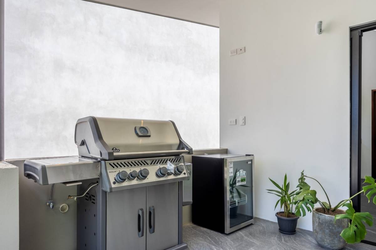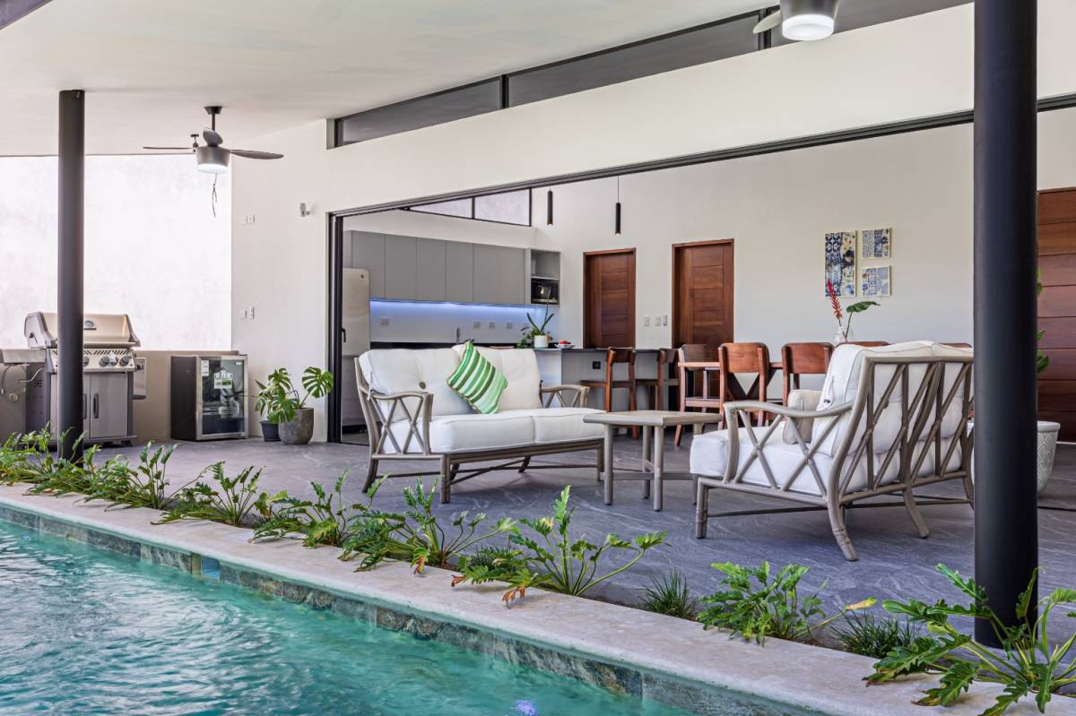 De grandes baies vitrées coulissantes mènent à la terrasse extérieure avec une véritable piscine. À droite, vous trouverez le barbecue et le bar réfrigéré, et à gauche, le cabinet de toilette et une douche extérieure.