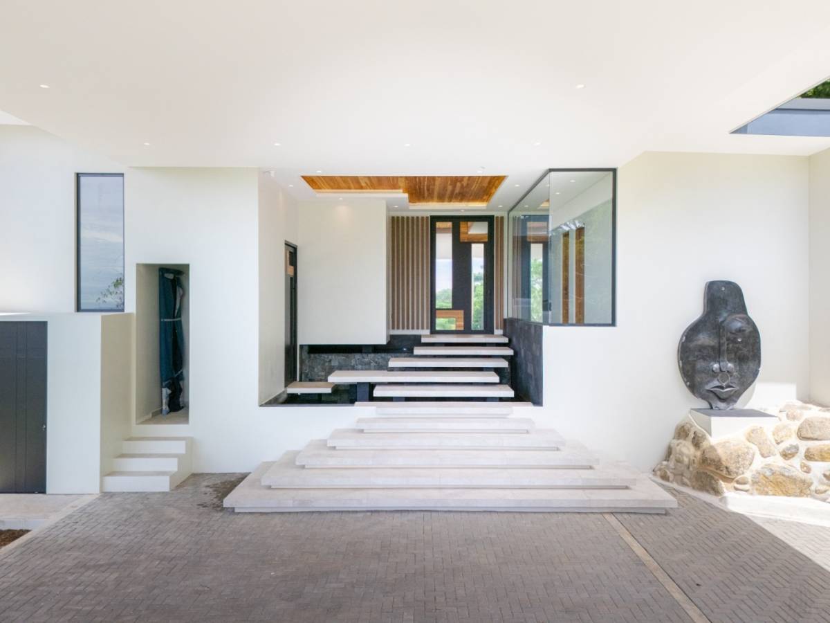 A custom pivoting steel door opens to a shimmering pond water feature, a tranquil prelude to the wonders within. The floating staircase, masterfully crafted elevates you into the expansive residence. From the moment you step inside, the villa reveals its artistry: entire walls of custom fabricated minimalist glass retract to erase boundaries, uniting the refined interiors with the sweeping deck, the infinity-edge saltwater pool, and the endless horizon of the Pacific Ocean.