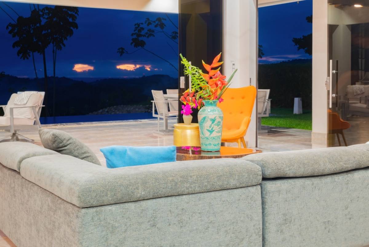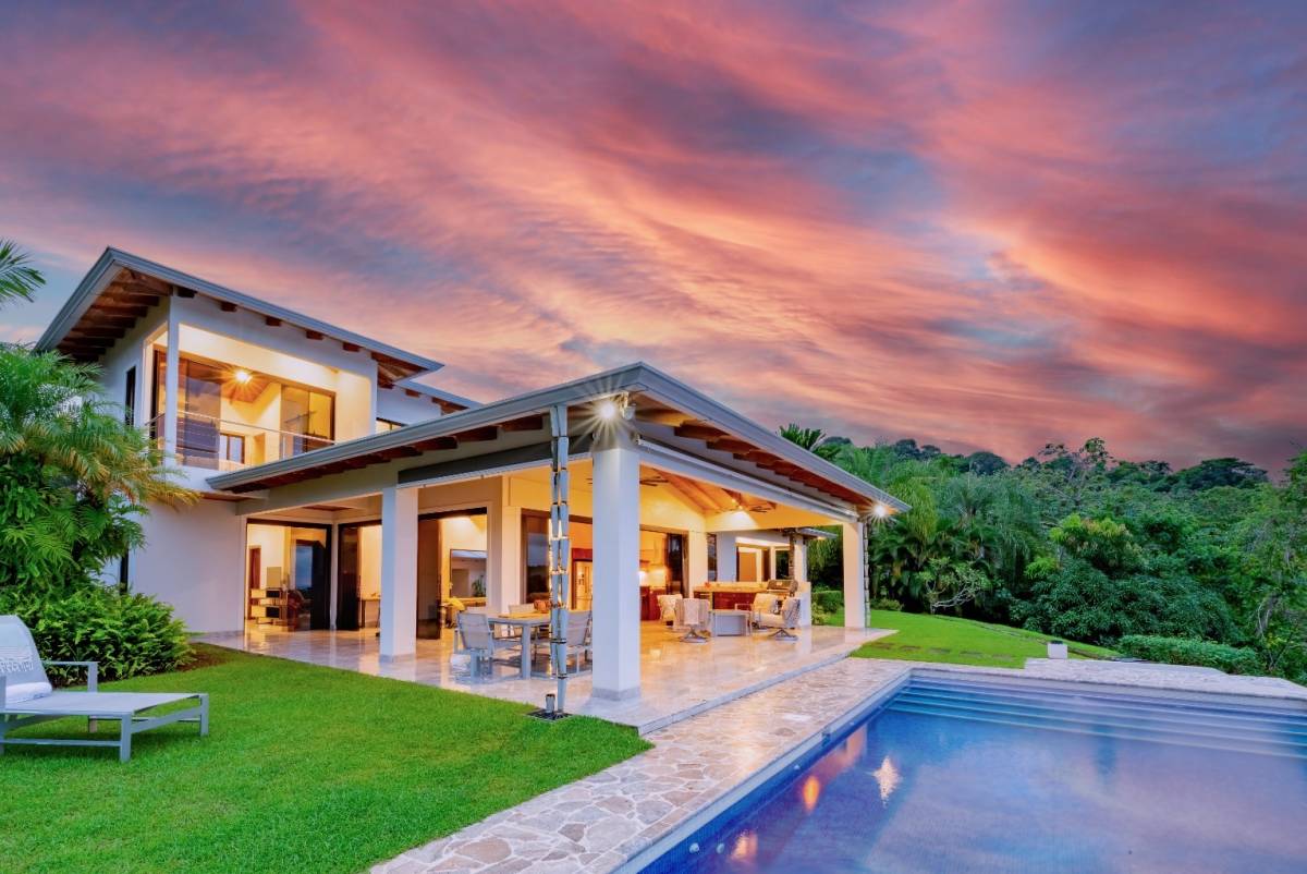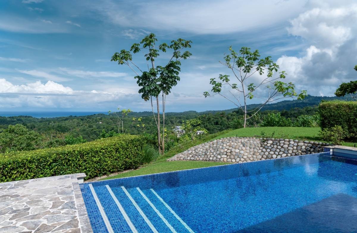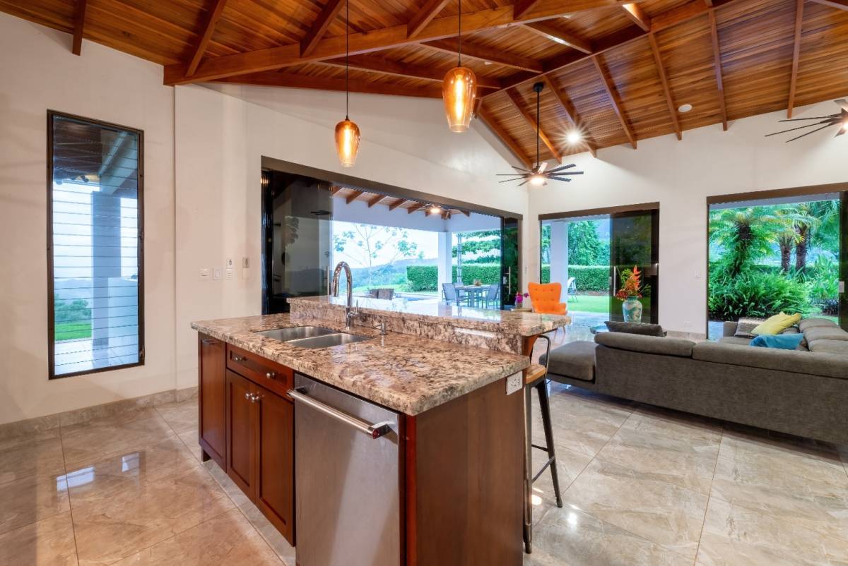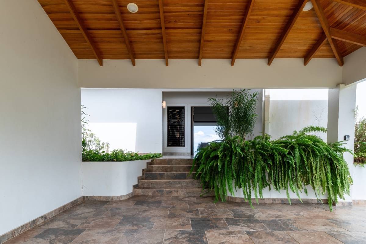 Nestled in the prestigious, sought-after community of Ojochal, Costa Rica, this exquisite residence offers an unrivaled blend of sophistication and natural beauty. Step through a lush, tropical garden entrance, where vibrant foliage guides you to the home’s grand entryway. Here, a curated selection of fruit trees—including lime, lemon, banana, avocado, apple pear, and mango—adds both charm and abundance to the landscape. Elegant floor-to-ceiling glass doors then unveil breathtaking panoramic ocean vistas, setting the tone for the refined experience within.