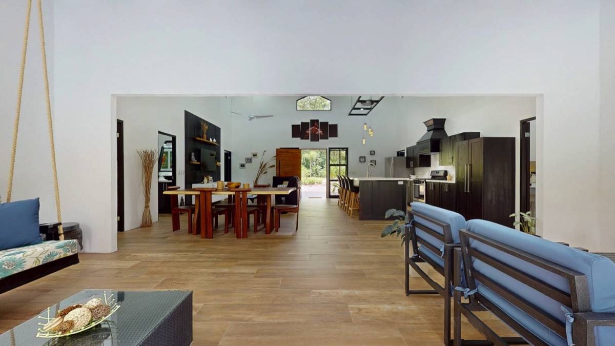 Every detail of this home was crafted with comfort, functionality, and style in mind. The open-concept living area connects seamlessly to the gorgeous contemporary kitchen, featuring stainless steel appliances, a large central island, and a spectacular Guanacaste wood slab dining table — a striking natural centerpiece that grounds the space in Costa Rica’s beauty.