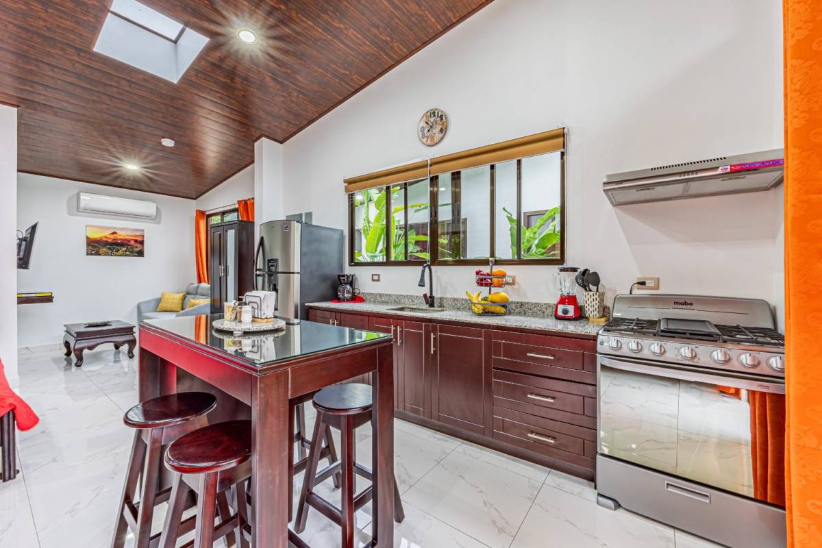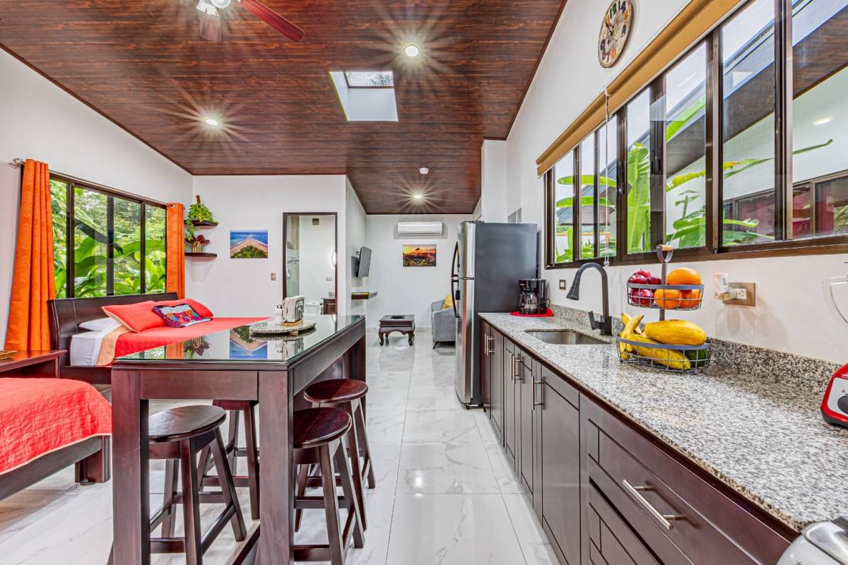 The property also boasts three charming Villas. Two of these comfortable 431 sq. ft. (40 m²) units are fully equipped with kitchens, full bathrooms, and cozy living areas with queen beds and TVs. Skylights fill the space with natural light, creating a bright, inviting atmosphere. Each casita also has a front patio with a table and chairs, ideal for poolside meals or enjoying the tropical surroundings. The third casita, measuring 377 sq. ft. (35 m²), offers a queen bed and similar amenities for a more intimate experience.