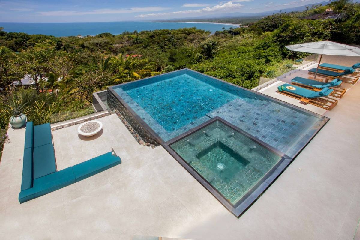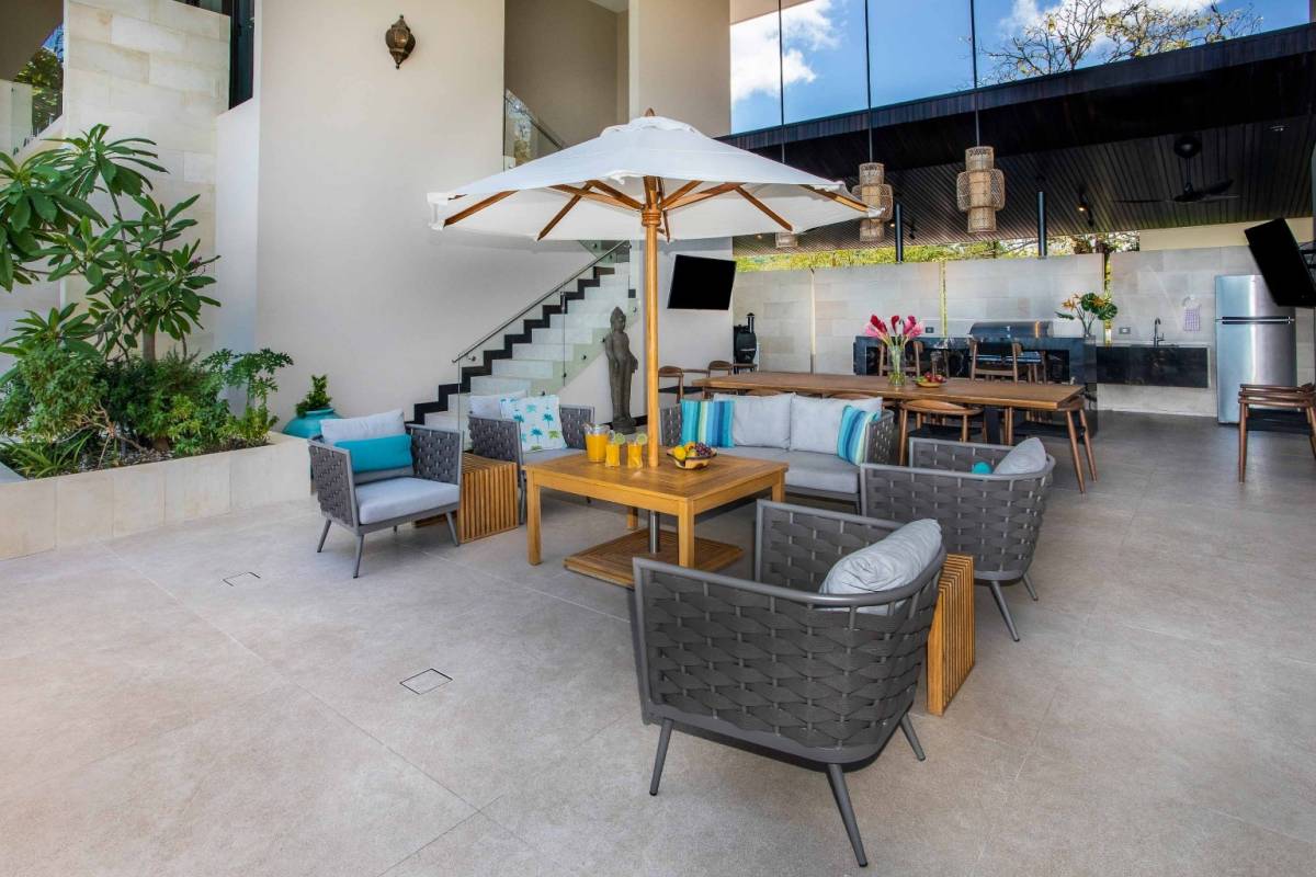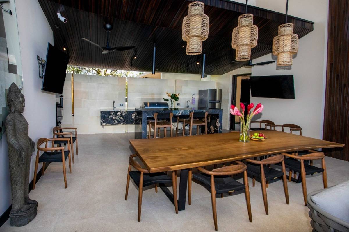 Outside, the infinity-edge pool appears to blend into the Pacific, creating a dramatic setting for relaxation. A generous covered terrace features a large dining table and premium Napoleon grill, absolutely perfect for alfresco meals while listening to the sounds of the jungle or enjoying a gorgeous sunset. A half bath and outdoor shower add convenience to the pool area.