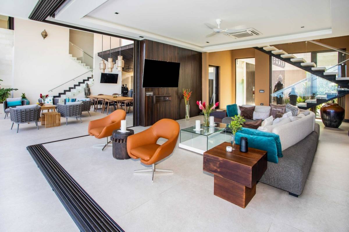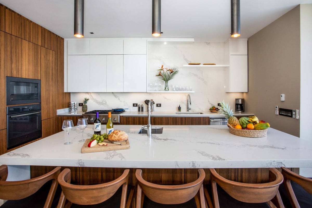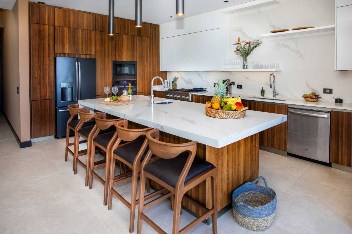 The expansive open-concept kitchen and living area creates a seamless atmosphere for gathering and entertaining. High-end appliances, premium finishes, and sumptuous seating define a space that is as functional as it is stylish, with large doors opening to the outdoor living spaces.