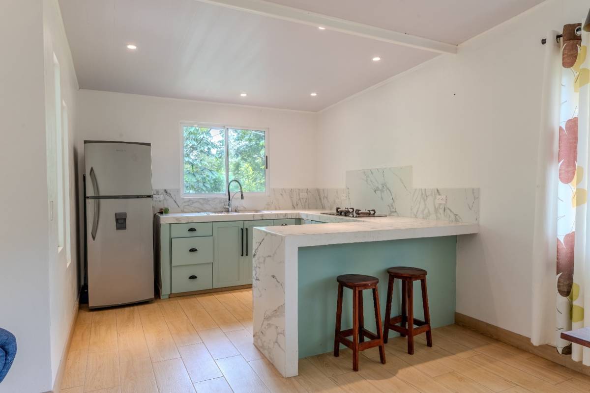 The second structure is a two-level modern duplex with an open layout. The upper level includes one bedroom, a bright kitchen, a large bathroom, and a generous balcony facing the jungle canopy—the perfect spot to enjoy morning coffee while listening to the calls of howler monkeys and tropical birds. The lower level, set partially below ground, offers two bedrooms, one bathroom, a spacious living area, and a kitchen with porcelain countertops and elegant cabinetry. Large windows fill the space with natural light and create a peaceful connection with the surrounding forest.