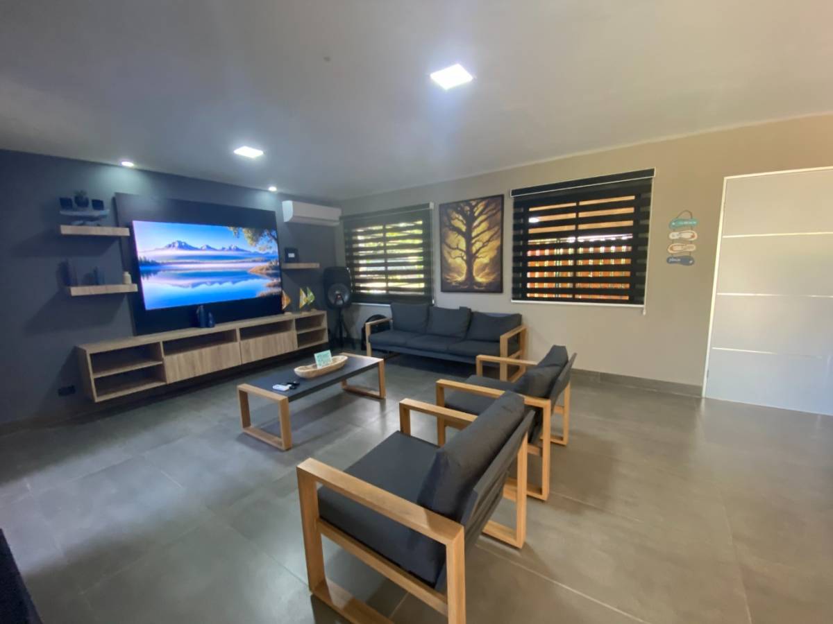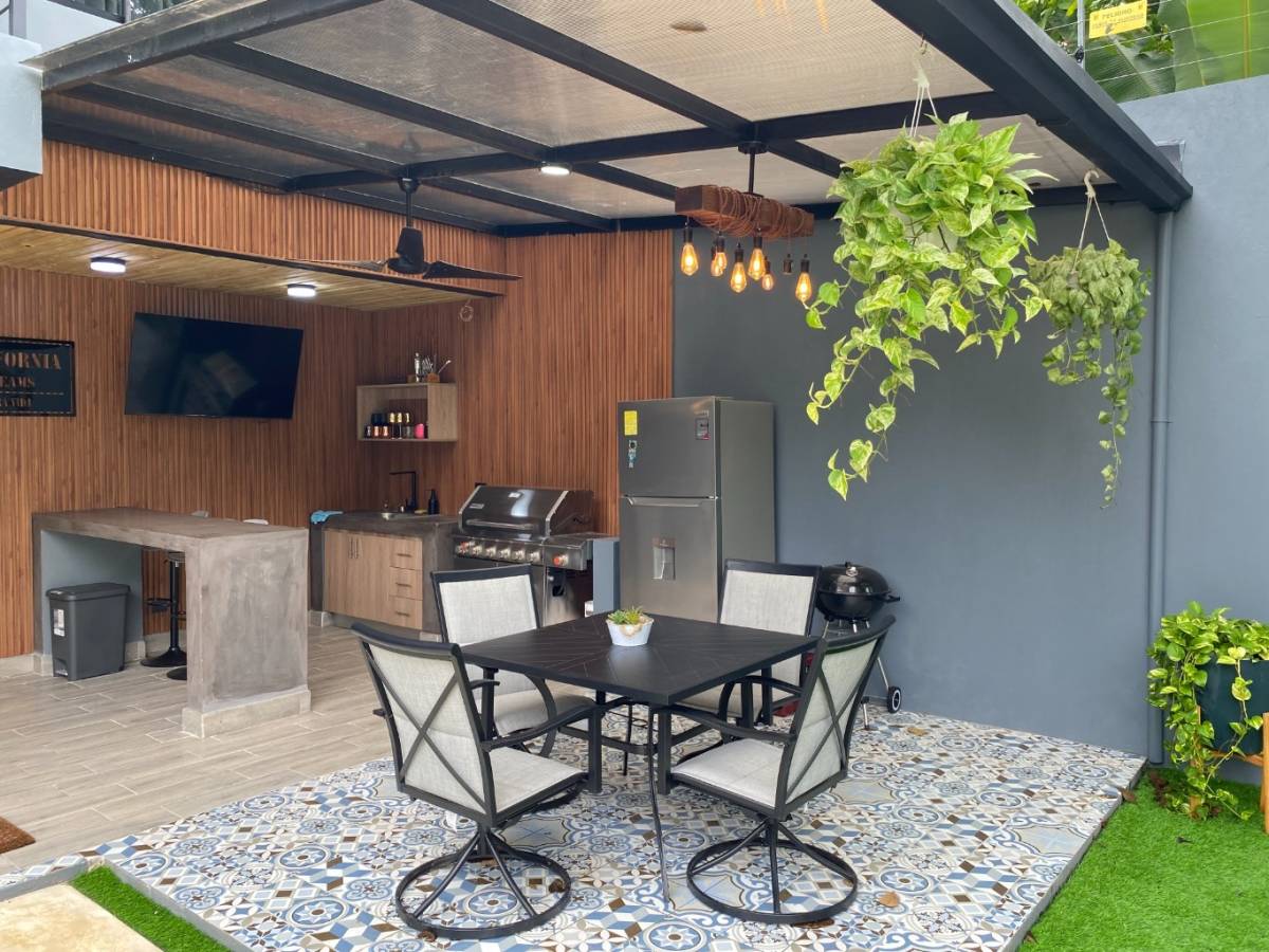 Lower floor: The bright and open social areas include a convenient half bathroom and a large covered terrace, creating seamless indoor–outdoor living. The terrace overlooks the manicured backyard and private pool. A dedicated grill kitchen, bar counter, and custom Guanacaste wood dining table make entertaining effortless.