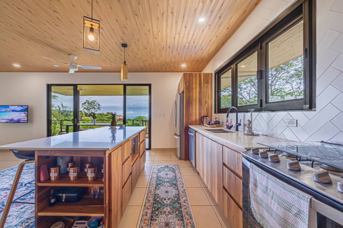 El piso principal te da la bienvenida con un diseño de concepto abierto, donde la cocina, el comedor y la sala se conectan perfectamente con la terraza cubierta. La cocina está terminada con hermosos gabinetes de teca maciza y encimeras de cuarzo, ideal tanto para el día a día como para recibir invitados. A solo unos pasos más abajo, el área de la piscina invita a relajarse mientras se disfrutan los sonidos y vistas de la selva y el arroyo cercanos. Un medio baño, lavandería, área de almacenamiento y amplio estacionamiento completan el nivel principal.