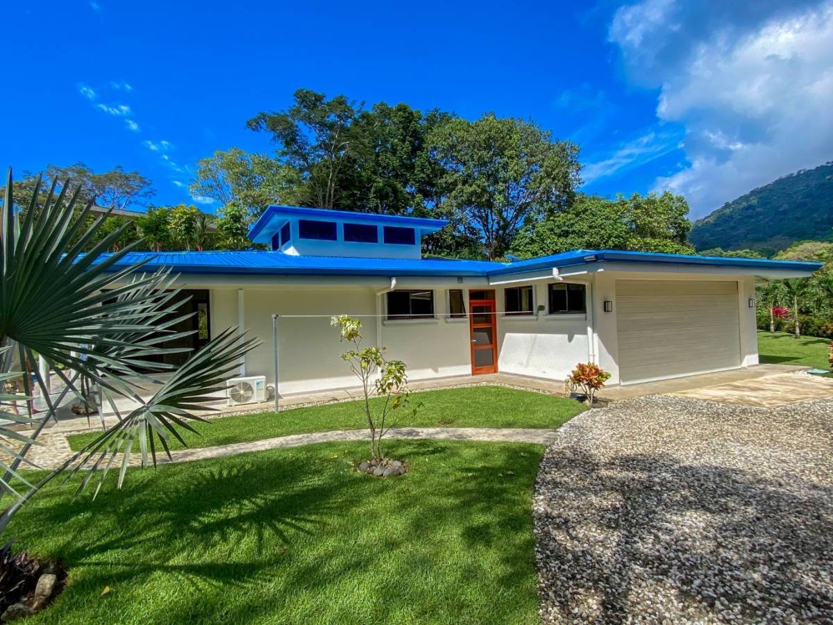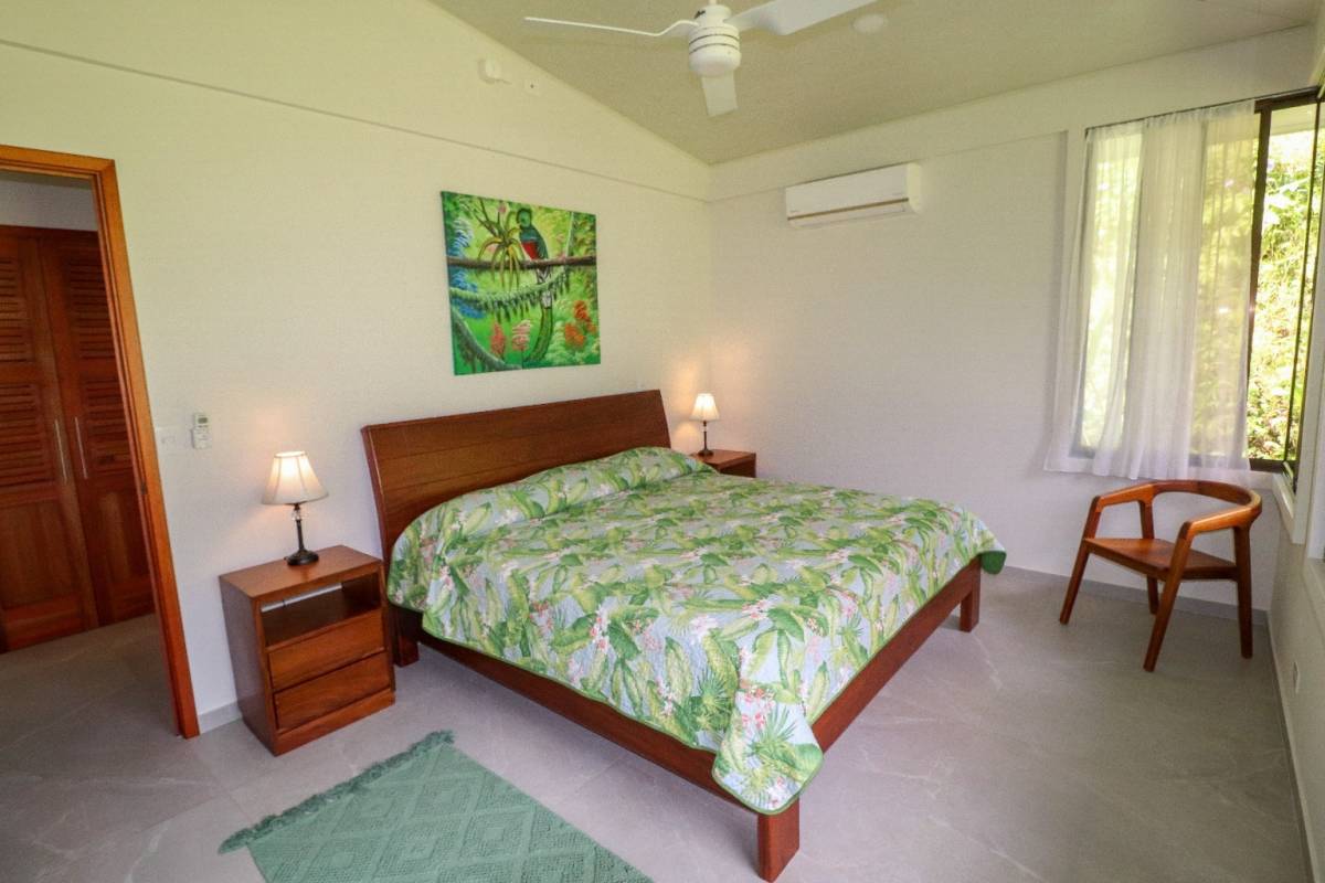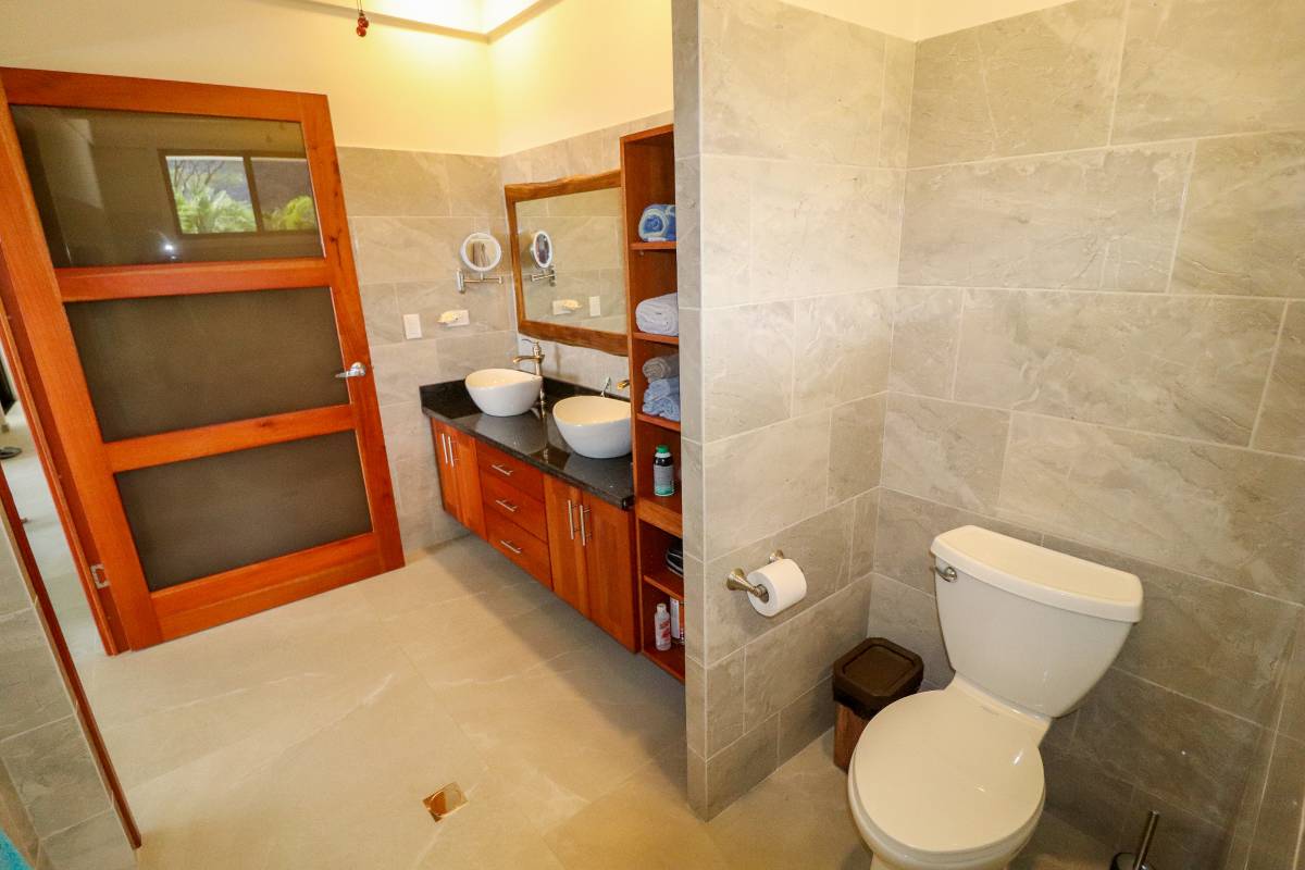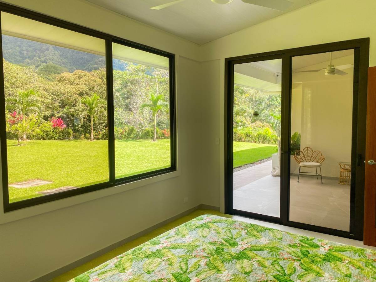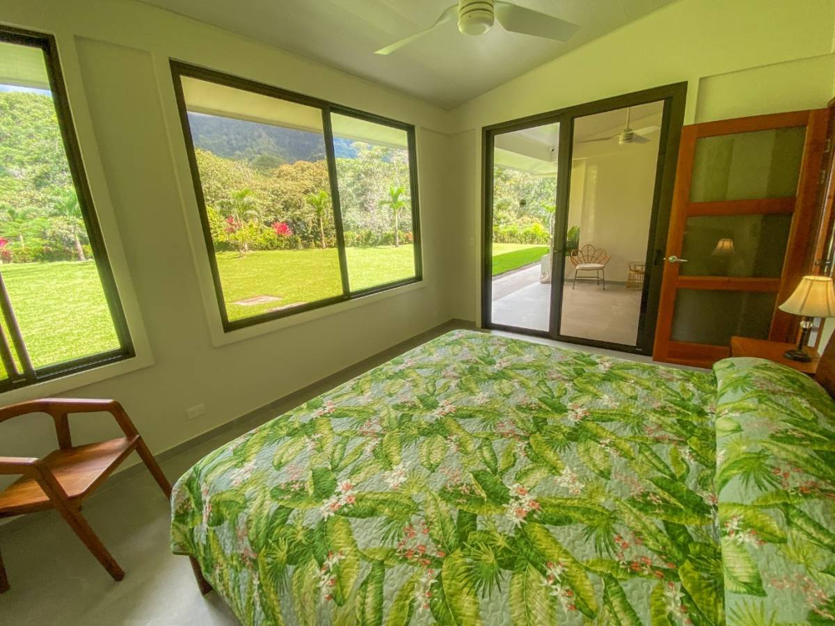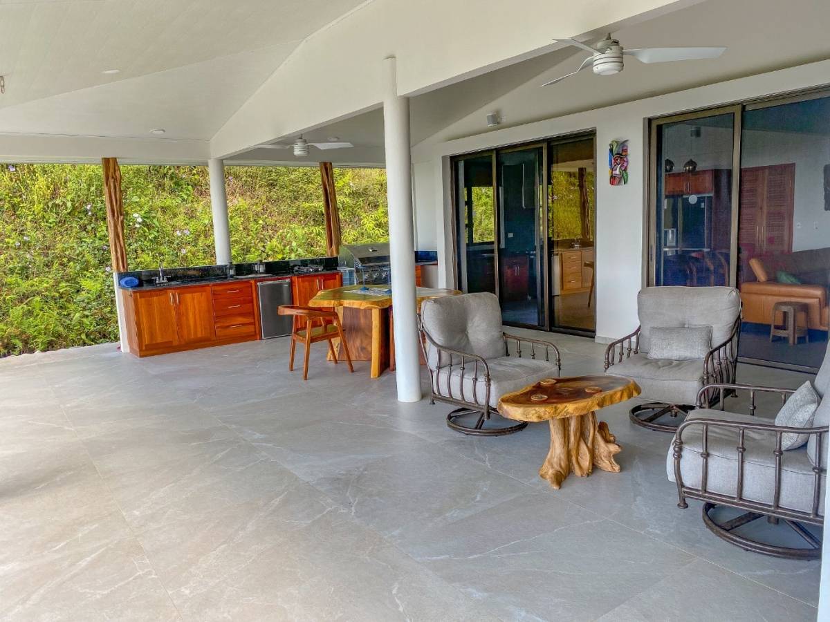 Also looking onto the ocean is the master bedroom – it benefits from a direct patio access via a sliding patio door, huge storage spaces, and a vast marble-clad ensuite. The lumber bed is absolutely beautiful. The second bedroom also holds a picturesque patio door, but it opens into the expansive manicured-lawn backyard behind the house. The back patio is covered and holds seating & a coffee table. Here, the ocean vistas are replaced by equally breathtaking, towering coastal mountains and their majestic cloud forests and primary jungles – not to mention the seasonal waterfalls.