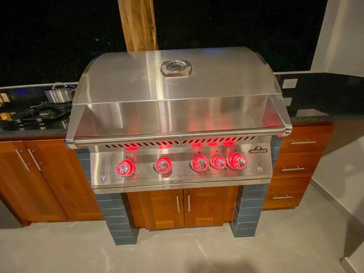 The focal area of the home is the front patio – a vast, airy, covered space which faces directly towards the ocean vistas. And with plentiful lighting and fans, the patio can be enjoyed rain or shine, day or night. But to call this a patio is a vast understatement – with a full kitchen (sink, bar fridge, gas stove, BBQ and amazing counter & cabinet space) and a work-of-art solid lumber dining table, this area is bigger than most guest homes! A beautiful coffee table and additional seating are also offered.