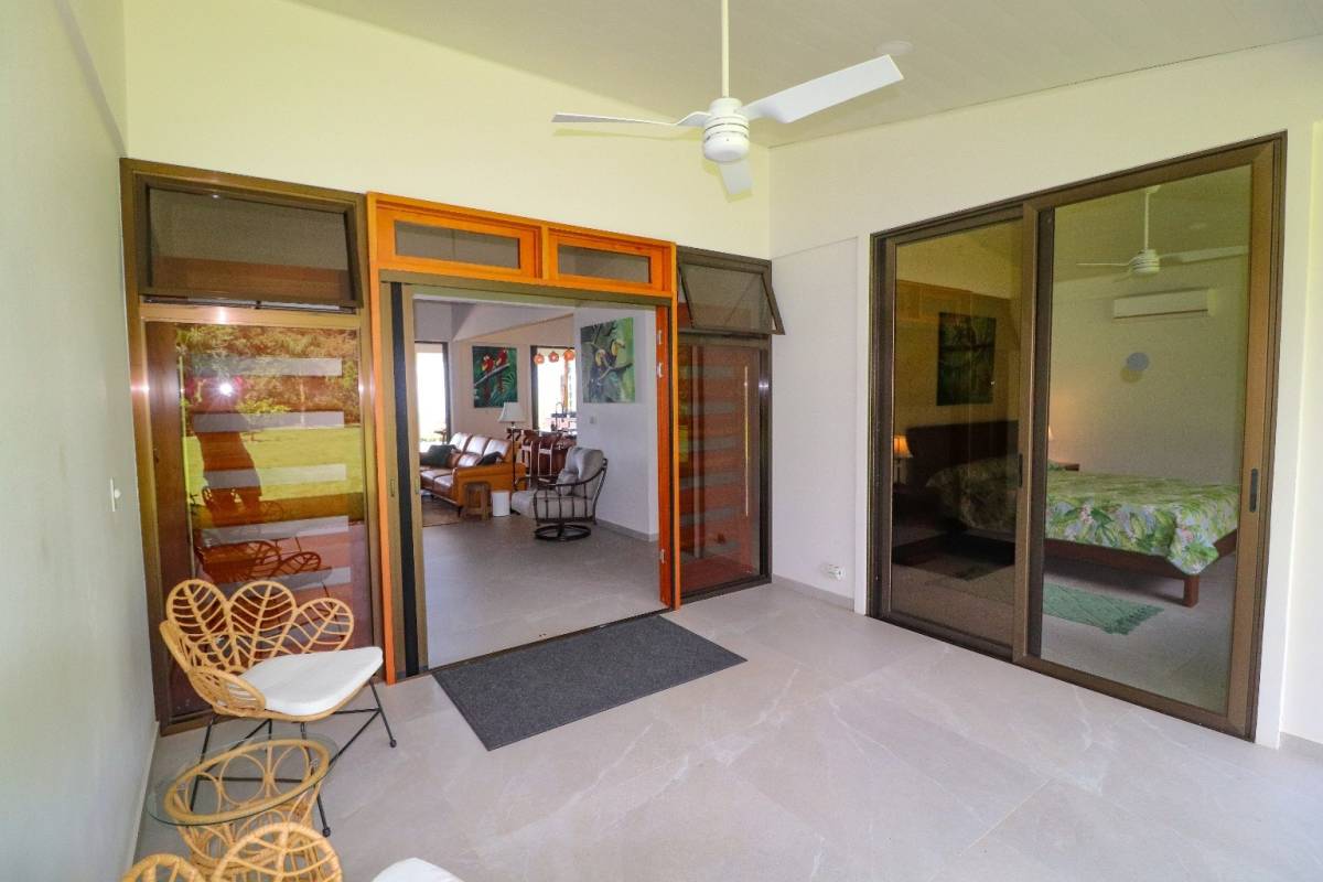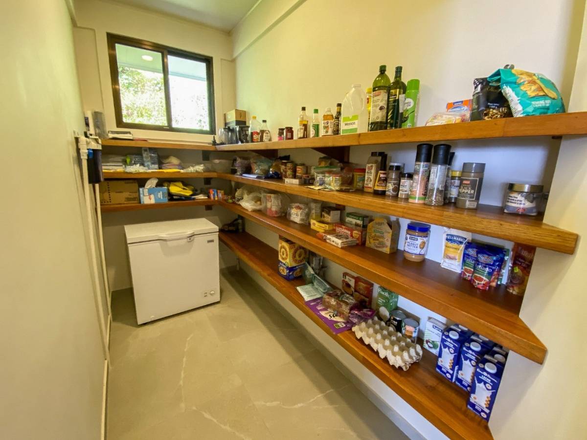 The main living / dining / kitchen area anchors the home. A sprawling, plus-sized kitchen will cater to the biggest of gatherings, with a breakfast bar complimenting the outdoor dining table. The counter and cabinet space needs to be seen to be believed! A large living area with a comfy L-couch, TV and a stunning lumber cabinet stands to entertain. Two shared bathrooms, a large pantry with a freezer, a storage nook and a fully equipped laundry room with a sink complete this amazing offer. The house is fully air-conditioned and decorated with vibrant tropical art & thoughtful classy accessories.