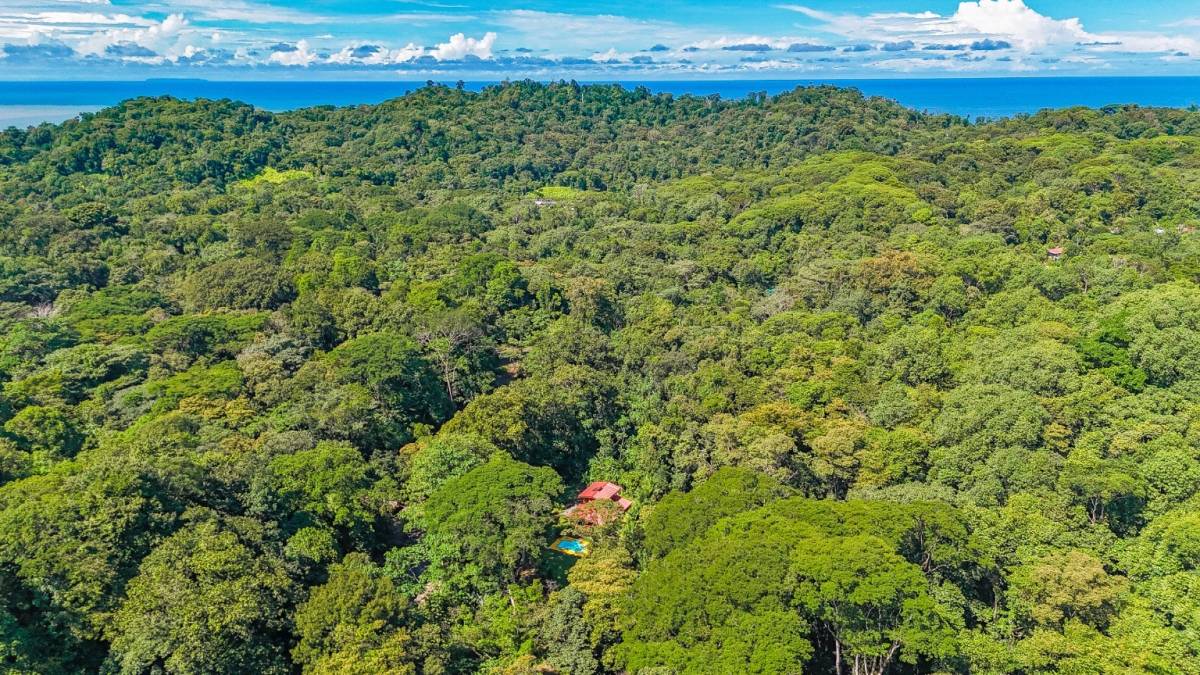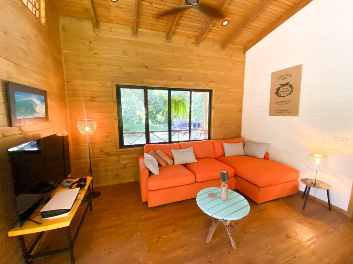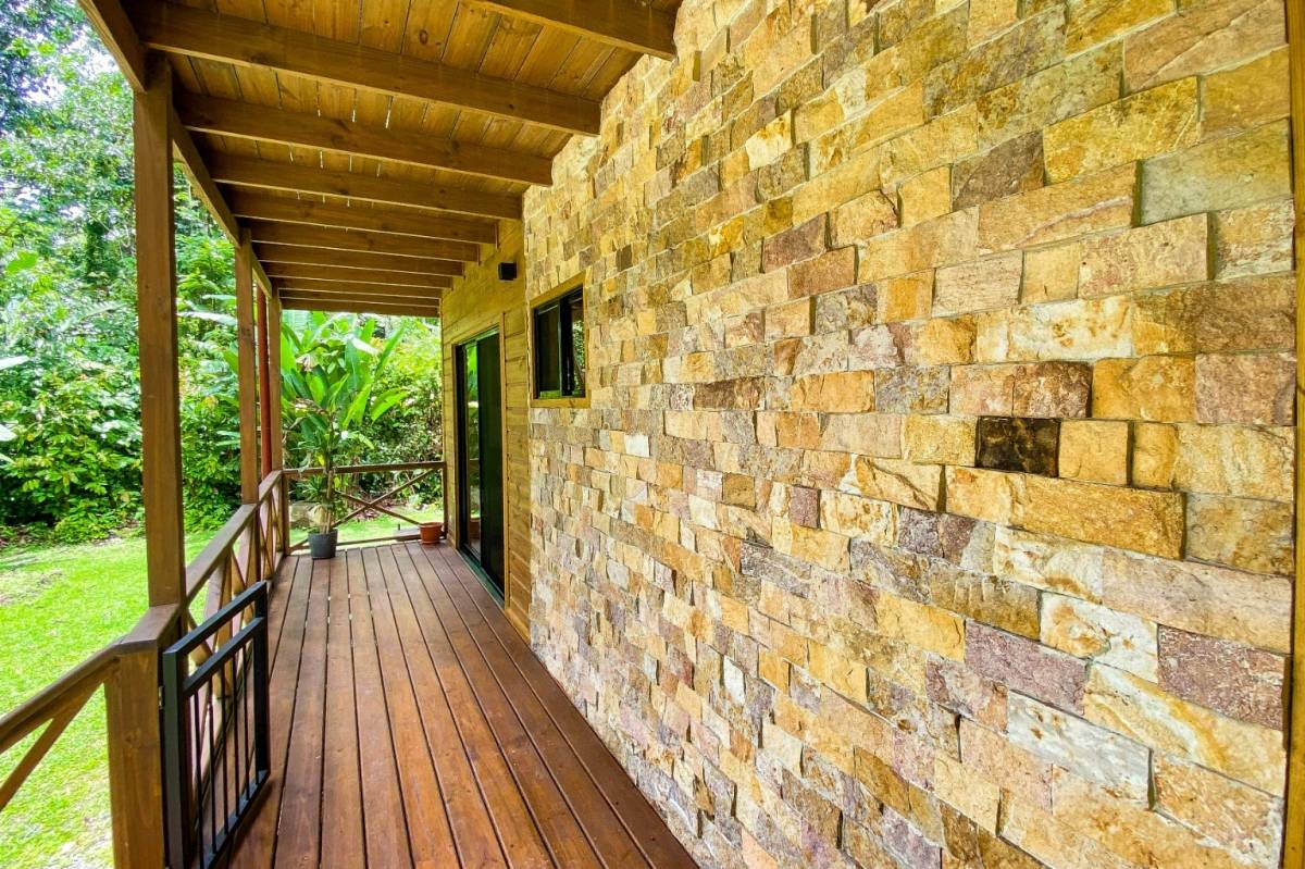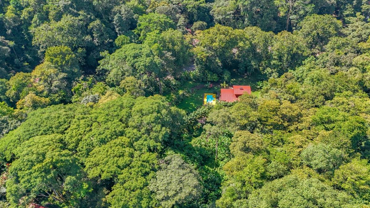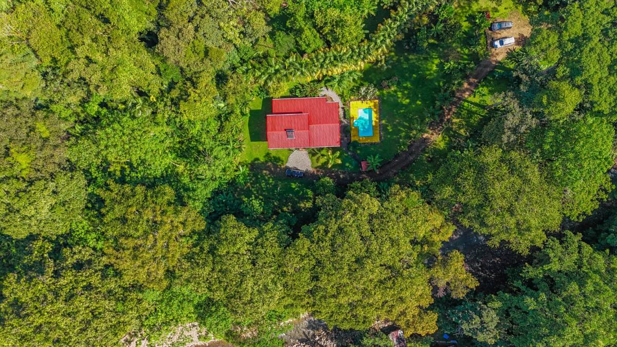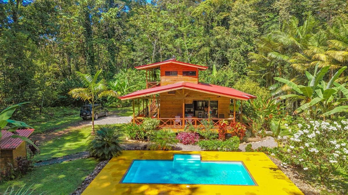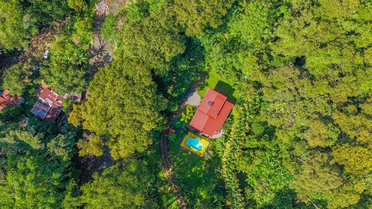 This 2-level, 3-bedroom home fits PERFECTLY into its rainforest surroundings. Beautiful & warm lumber graces both the exterior and interior of the home & tastefully contrasts with the blue pool, sunny yellow pool-deck and the bright red roof of the home. Areas of external stone cladding anchor the home and compliment the riverstone banks of the nearby Rio Media Luna which borders the property.