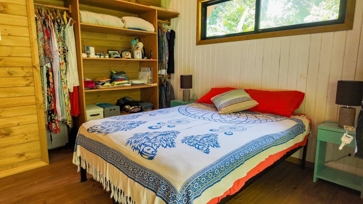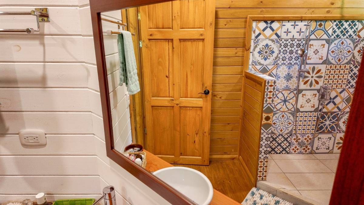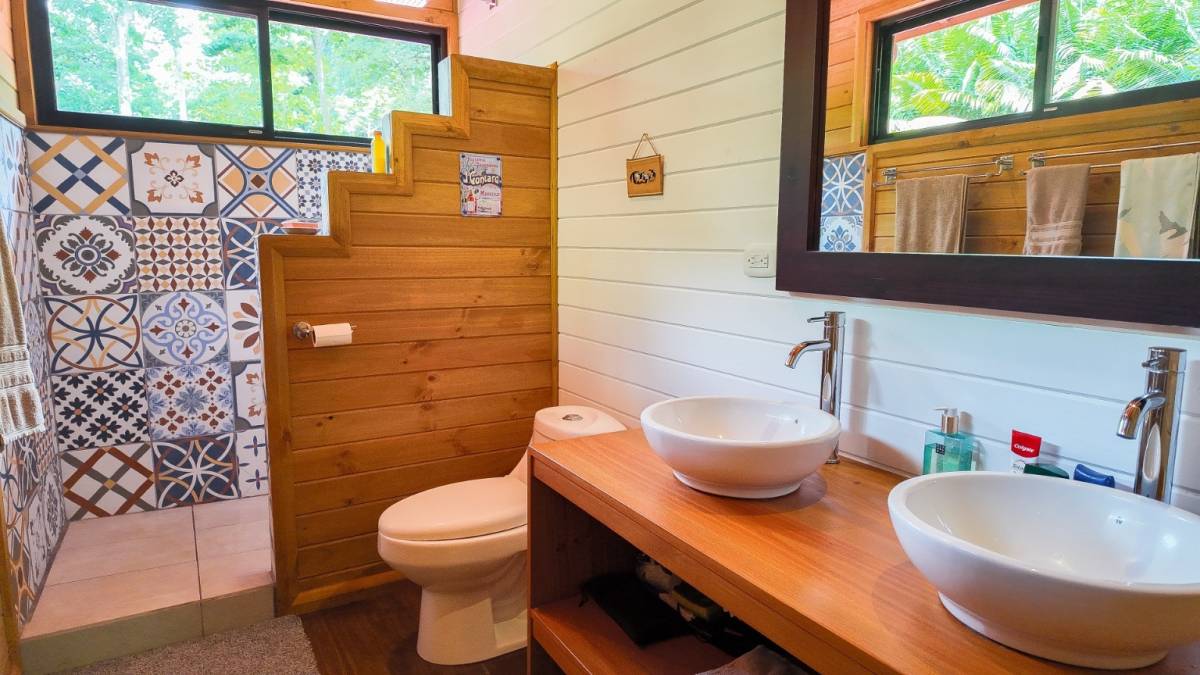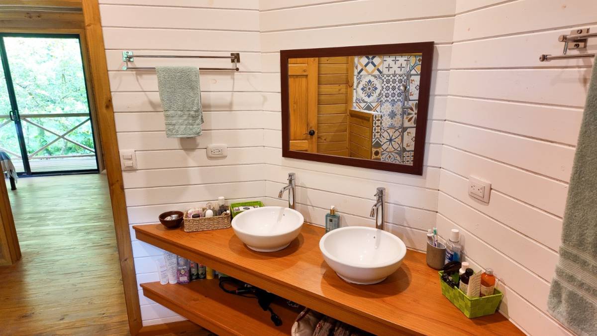 Two lower bedrooms, big and well-served with accessories and storage areas, offer sliding-door access to the covered outside verandah & patio area. A shared bathroom and shower is finished with plentiful Spanish tiles, white accents, and the same warm lumber that permeates the home. A separate laundry area holds plenty of storage space. Upstairs, the Master Bedroom with ensuite & wrap-around verandah occupy the entire floor – perfect privacy with stunning rainforest views.