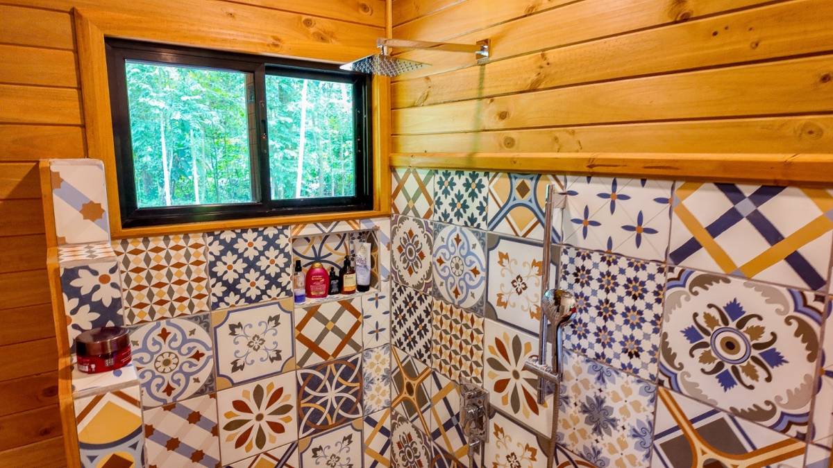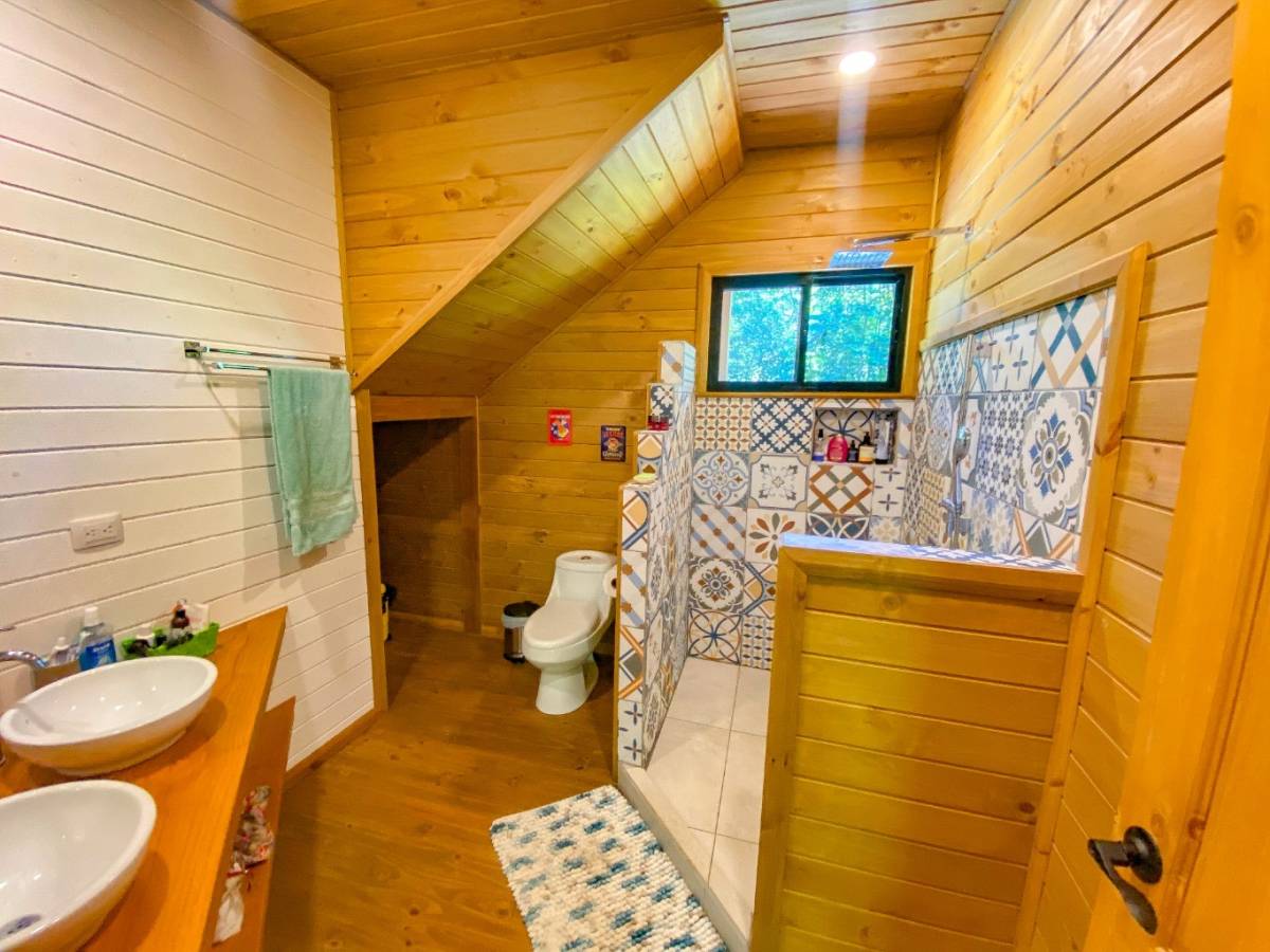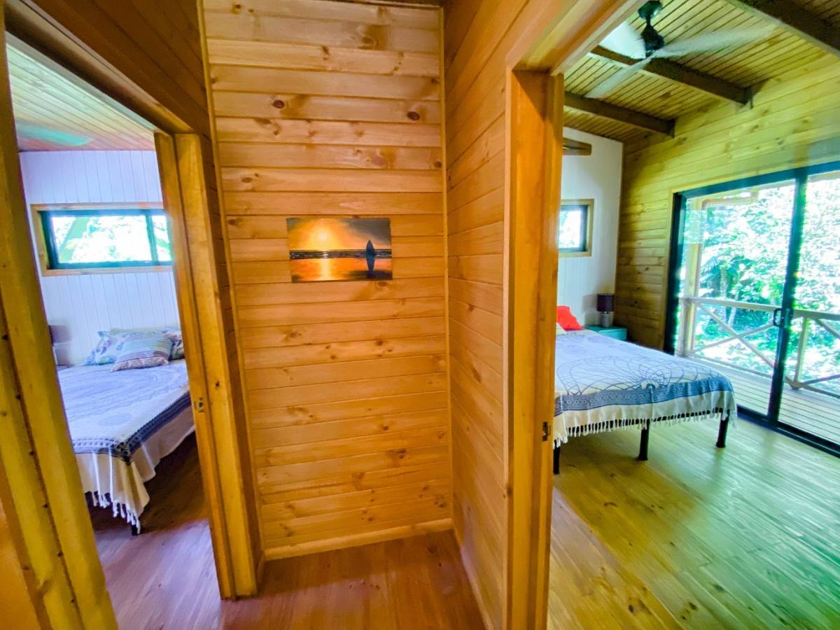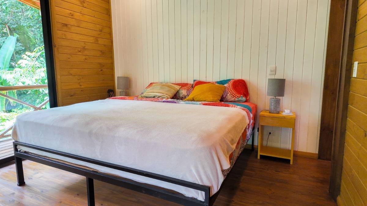 Two lower bedrooms, big and well-served with accessories and storage areas, offer sliding-door access to the covered outside verandah & patio area. A shared bathroom and shower is finished with plentiful Spanish tiles, white accents, and the same warm lumber that permeates the home. A separate laundry area holds plenty of storage space. Upstairs, the Master Bedroom with ensuite & wrap-around verandah occupy the entire floor – perfect privacy with stunning rainforest views.