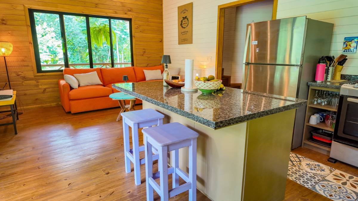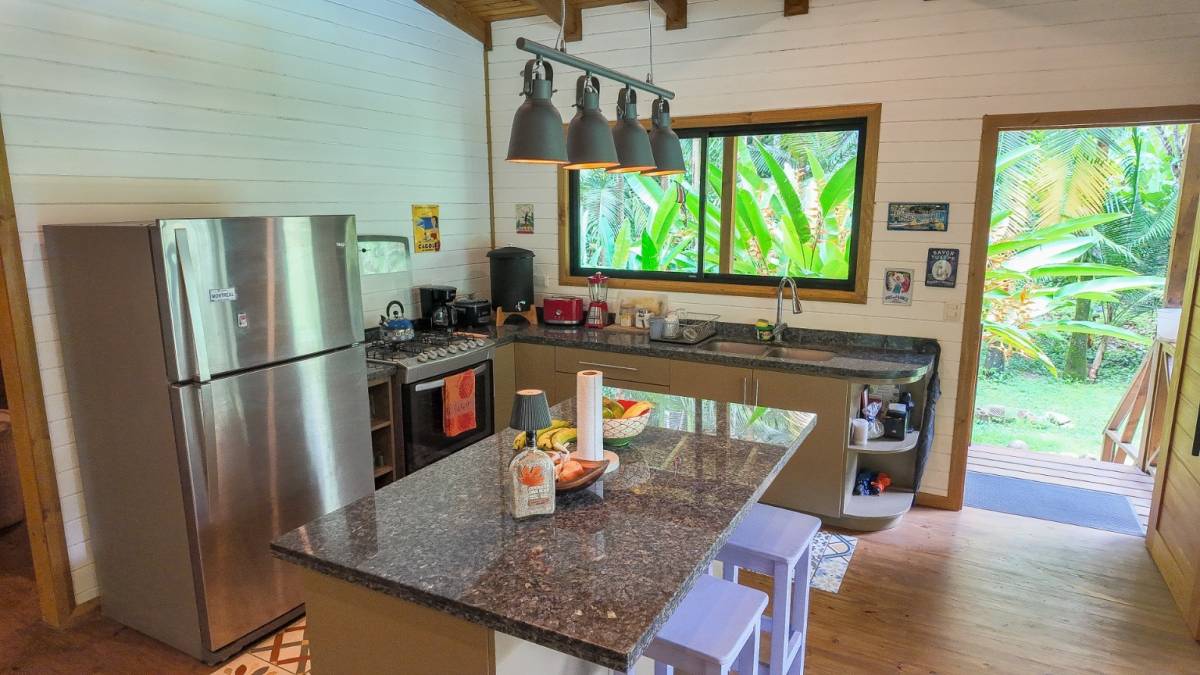 The owners have planted a tropical orchard – mango, avocado, cocoa, bananas, blackberry, lemon trees and pineapple plants are producing fresh, organic gifts of nature. Imagine waking up, stepping out into the tropical air and picking off fresh bananas or mangos for your morning shake, which you will enjoy by the burbling river. Paradise indeed.