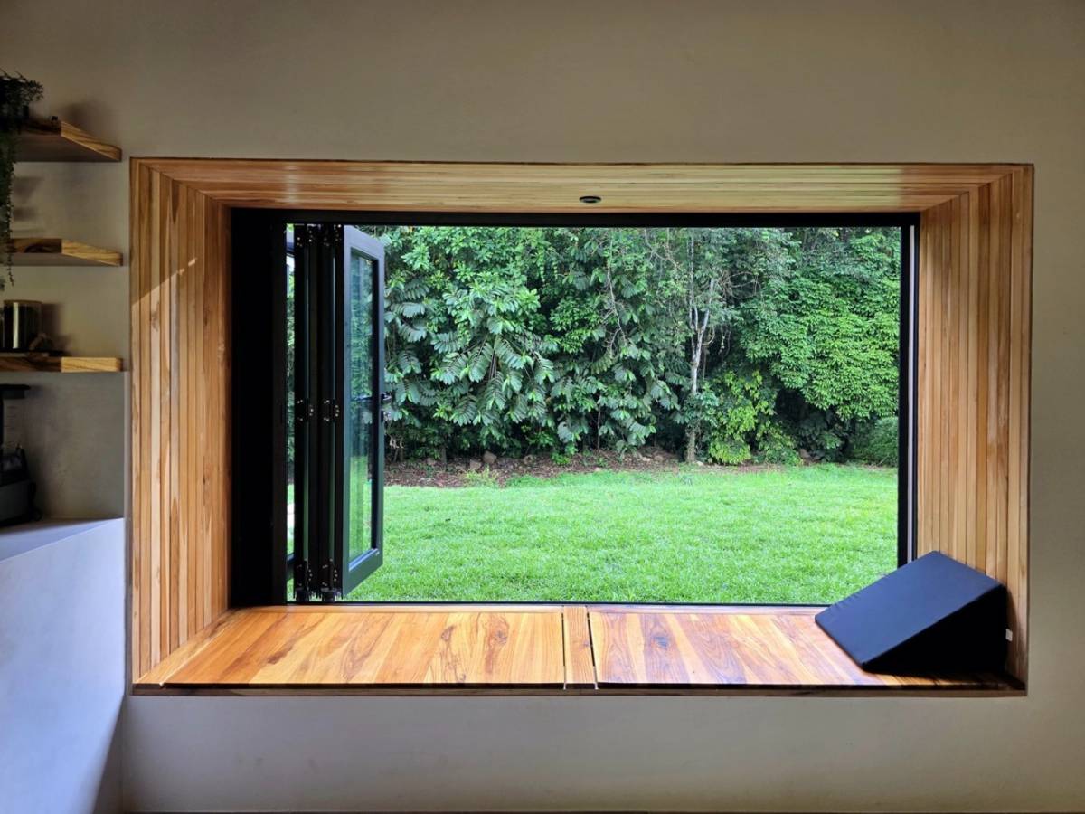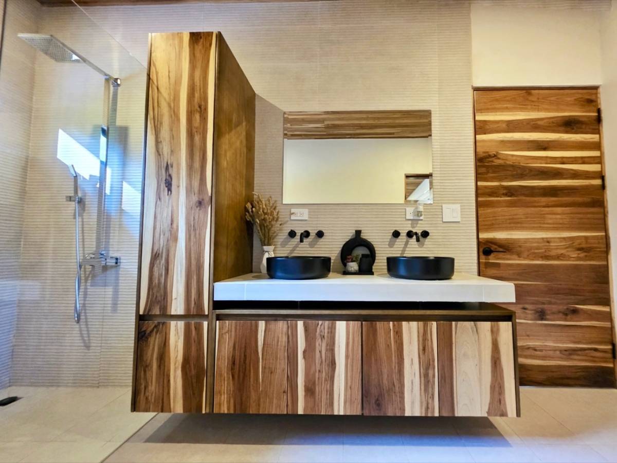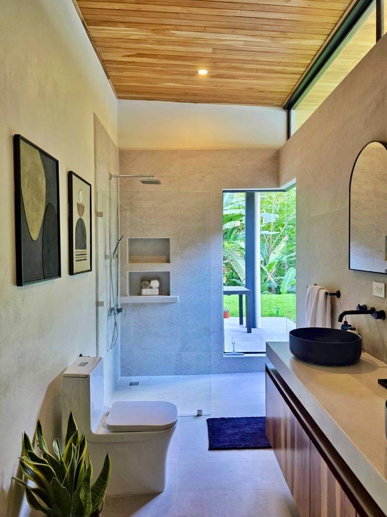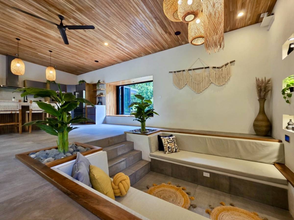 The primary suite offers complete privacy and calm, set apart from the two guest bedrooms. Sliding doors open either onto the pool terrace or a private jungle-facing patio. It also includes a walk-in closet and a bright bathroom with double sinks. The two additional bedrooms share a Jack & Jill bathroom and each has direct access to the terrace. All bedrooms come with king-size beds and air conditioning for total comfort. At the heart of the home, the custom wooden kitchen is both stylish and practical. A spacious central island connects the kitchen, living room, and terrace, creating a natural gathering place for cooking, conversation, or simply enjoying the peaceful surroundings. A striking built-in bench beneath a large picture window frames the lush greenery outside, inviting quiet moments and a true connection with nature. Two cozy recessed lounges, indoor and outdoor, enhance comfort and create a relaxed social flow.