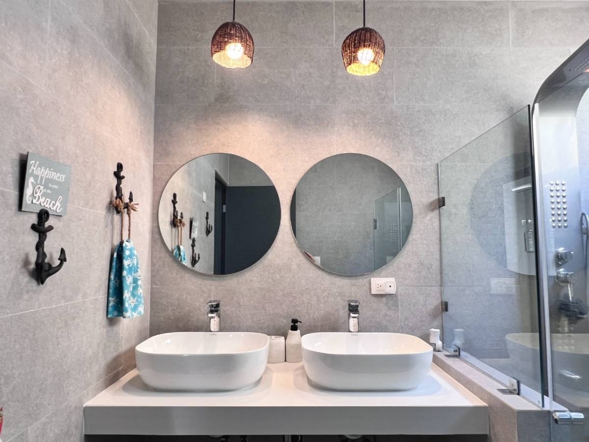 Bathrooms tiled floor-to-ceiling