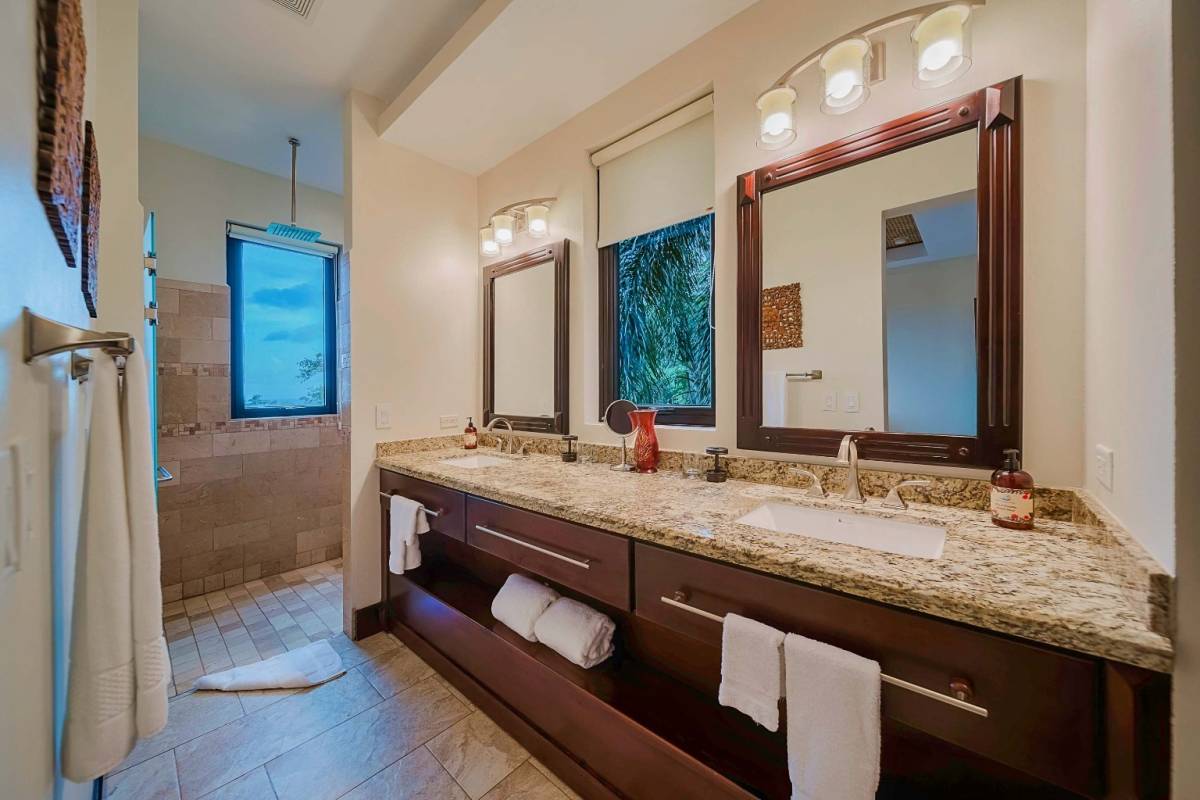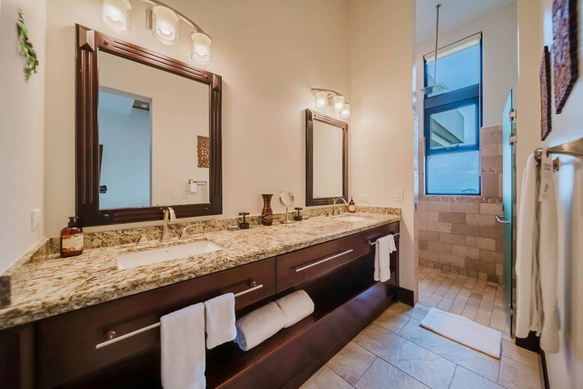 Every suite offers ocean views, en-suite bathrooms, and the highest level of comfort, making the property as functional as it is beautiful. With a sleek blend of glass, stone, and open-concept tropical living, the estate captures both elegance and ease, seamlessly connecting indoor and outdoor spaces. The main residence offers three spacious suites on the middle level of the home along with an open-air yoga deck set into the core of the home. The bottom level of the home, still with ocean views from EVERY room, has a similar layout of three spacious bedrooms with their respective en suite bathrooms and a bonus den, with air conditioning and an entertainment center accessed through an internal garden framed by two multi-story functional water walls.