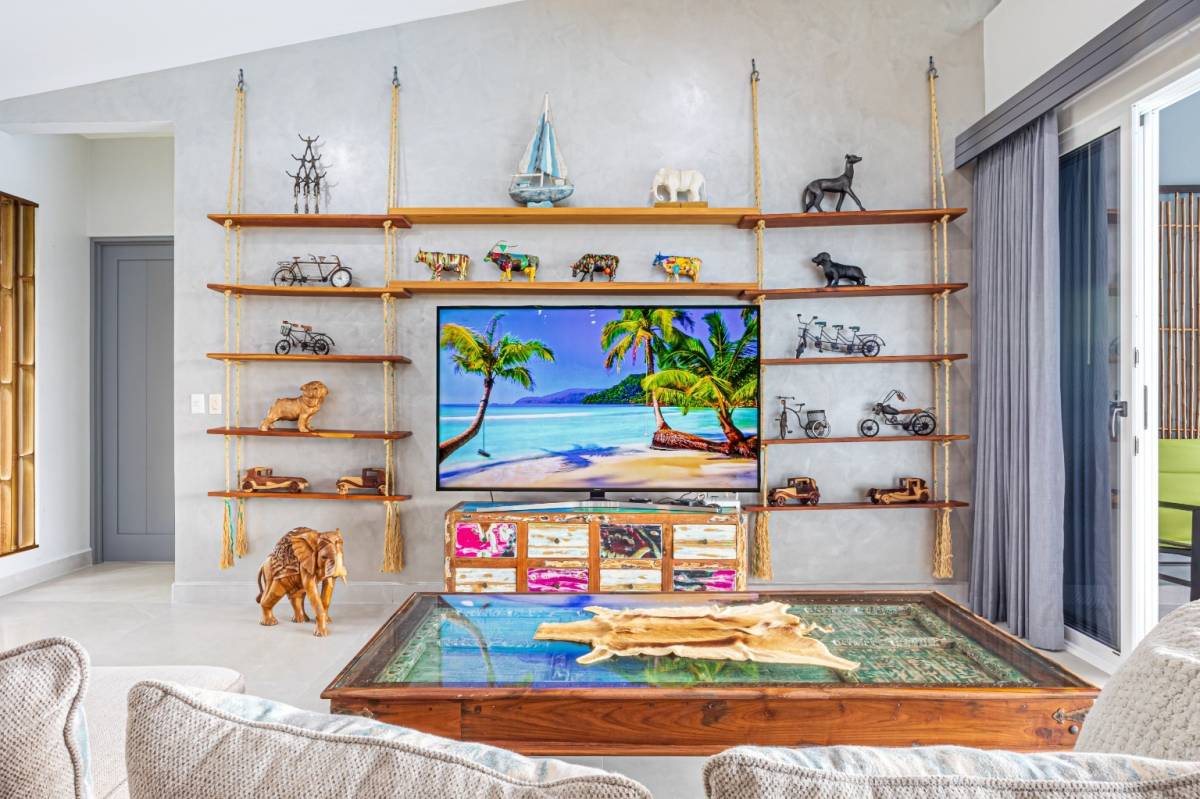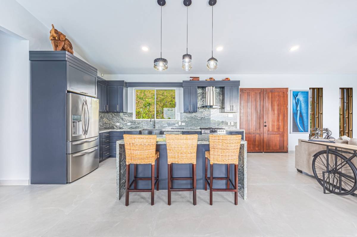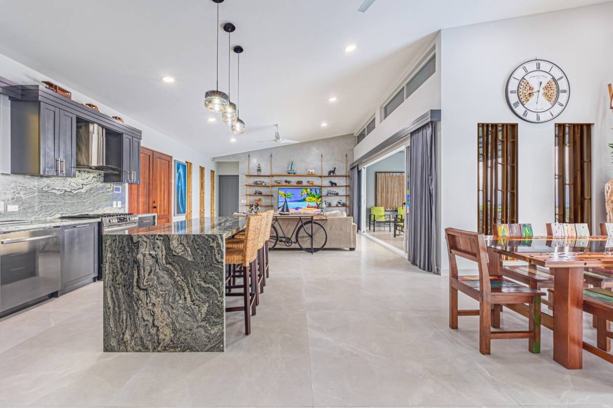 The gourmet kitchen is a chef’s dream, boasting high-end finishes, custom cabinetry, and stainless-steel appliances — a perfect space for culinary creations and entertaining. The open-concept living areas flow seamlessly toward the expansive outdoor terrace, where panoramic views of the ocean and jungle create an ever-changing masterpiece of color and light.